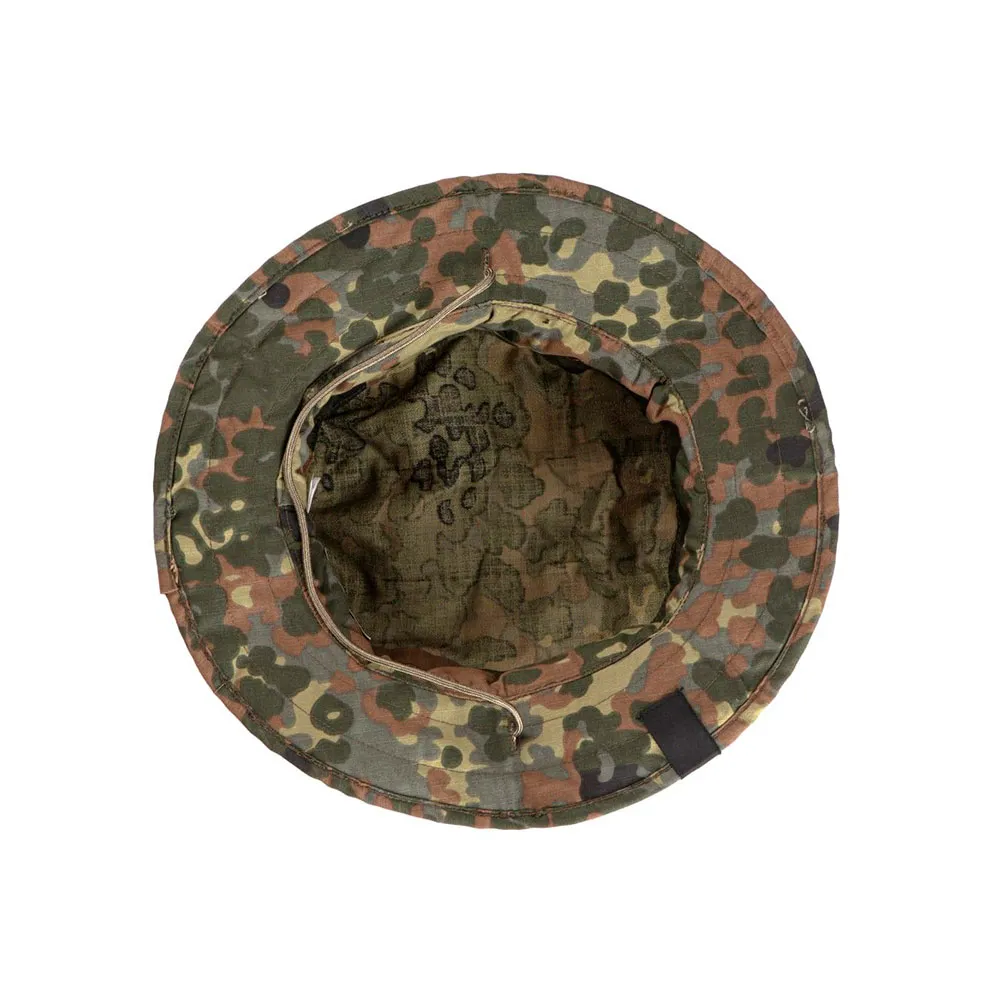 Mod 2 Boonie Hat is manufactured from high-quality rip-stop textiles and features several improvements over the original design. The rim of the hat was slightly narrowed down to prevent snags in bushes and heavy foliage without omitting the hat´s performance. Another modification is adding a piece of fabric that allows the attachment of branches and vegetation. The same was done for the top of the hat in the form of four crossed pieces of cloth. Together, they increase the hat´s camouflage properties and break down the head´s silhouette.