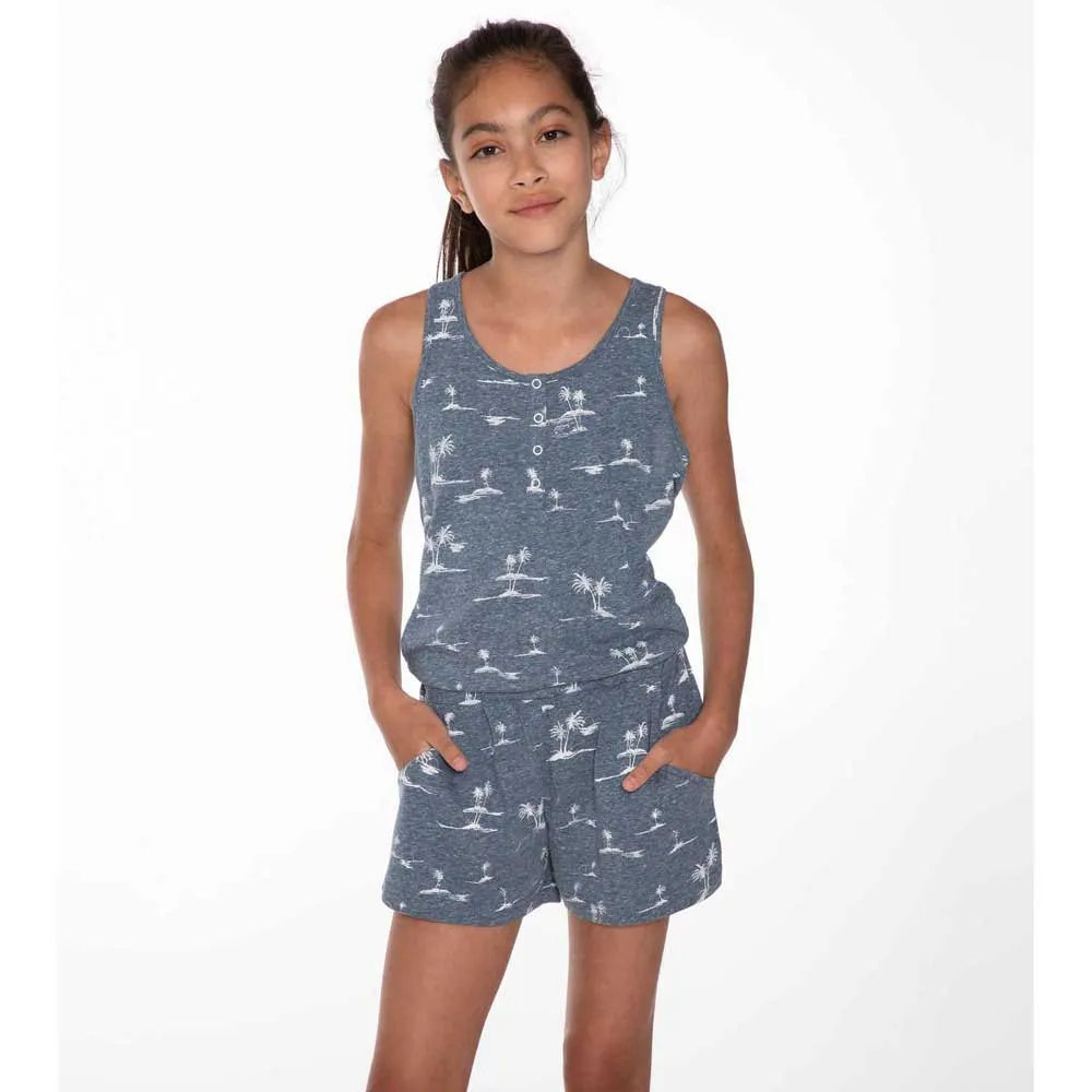 Check out the fabulous Honey JR by Protest. The melange fabric is printed with a tropical island design. There is a short placket at the neck with press buttons. The playsuit has a racerback style. The waist is elasticated and there are handy side pockets. Perfect for your summer in the sun, the Honey JR by Protest.