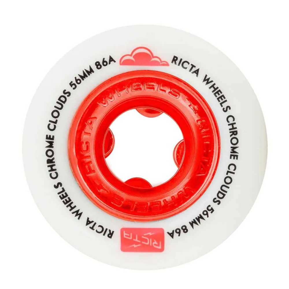 Ricta Chrome Clouds 56mm, 86a, white with chrome red core. 86a medium-soft urethane for filmer setups, skating ditches and rougher terrains.