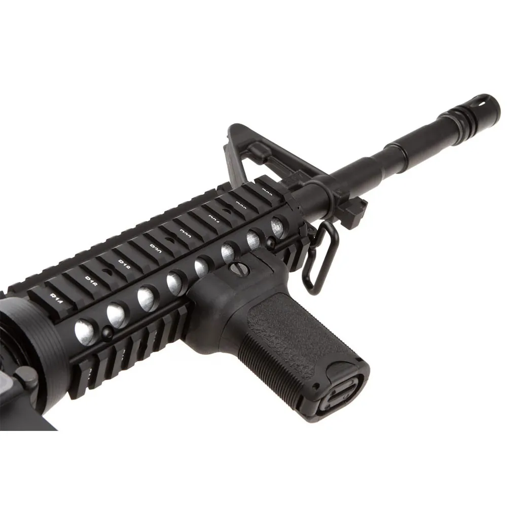 The upper and lower receiver, outer barrel, buffer tube, and other metal elements are hard coated in a matte, scratch-resistant Nano Coating finish. This protects the replica from harsh field treatment and prevents damage.