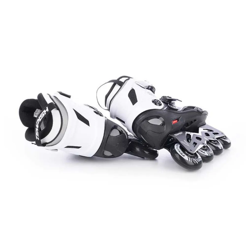The skate liner is ventilated, has holes around its entire circumference and reinforced with PVC at the top. There is an elastic neoprene in the area of the fingers to increase comfort. In the back, there is a loop with a reflective strip. Reflective parts are also added on the outside of the skate. In the area of the Achilles tendon, the liner is lowered and shaped into a V-shape, which enhances manoeuvrability and mobility, and thus easier execution of freestyle tricks and moves. The liner has cut-outs in the area of the ankle bend sewn with elastic neoprene, which achieves optimal anatomical dispositions of the liner while maintaining its rigidity. The lower part of the liner uses a material that slides less in the skeleton. The shoe has an anatomical insole with a thickness of 3 mm, which is comfortable enough, yet not too soft.
