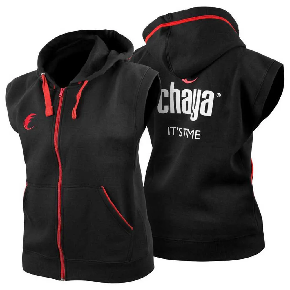 Disponible en el clásico color Chaya, negro con ribete rojo, el logo de Chaya y el lema colocado en la parte posterior de la sudadera con capucha y un pequeño 'emblema de plumas' de Chaya a la derecha del pecho.