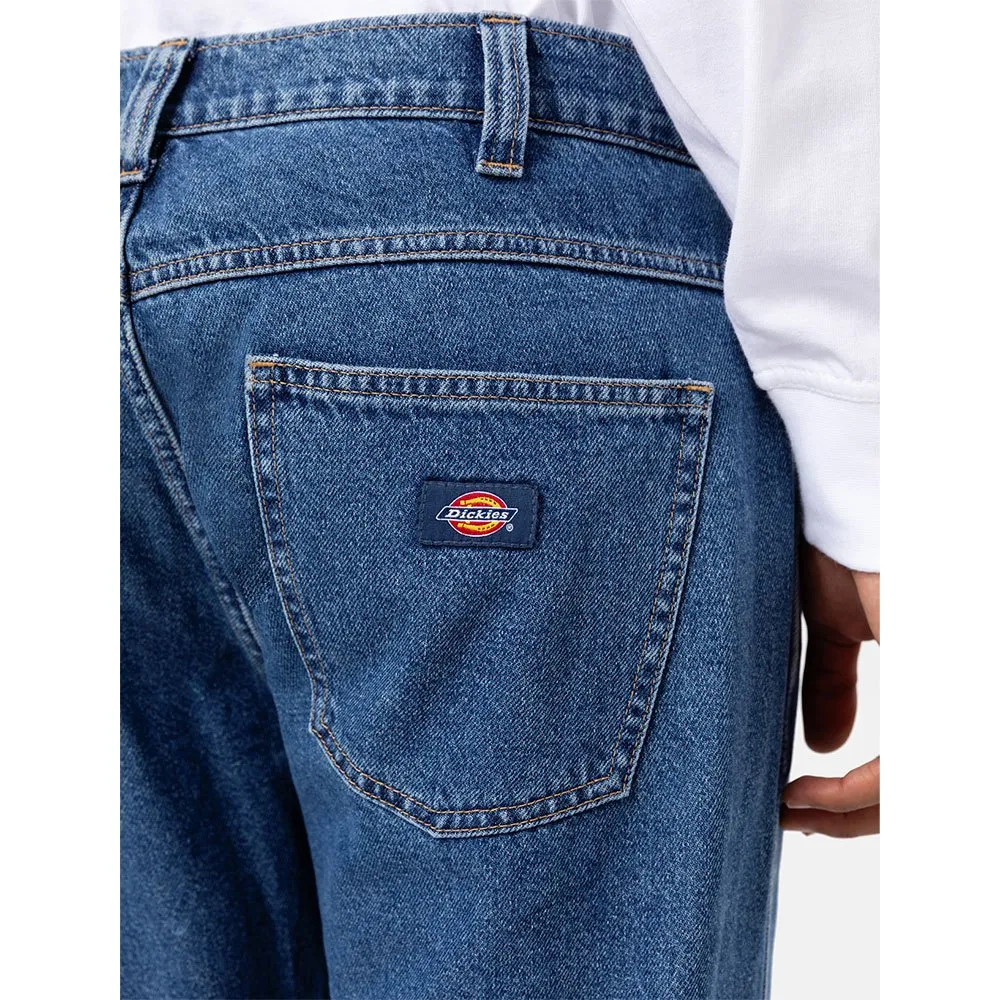 El pantalón Houston Denim es un jean de corte relajado, pierna recta, cintura regular y 5 bolsillos con nuestra icónica etiqueta tejida Dickies en el bolsillo trasero.