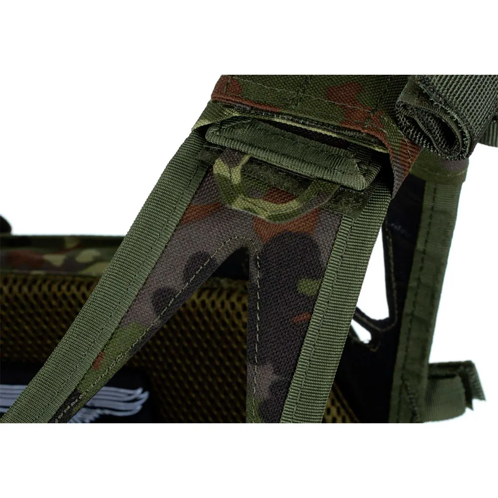 Alrededor de los hombros se encuentran ocho correas flexibles para fijar cables Comtac o tubos de hidratación.
