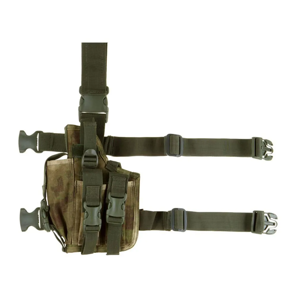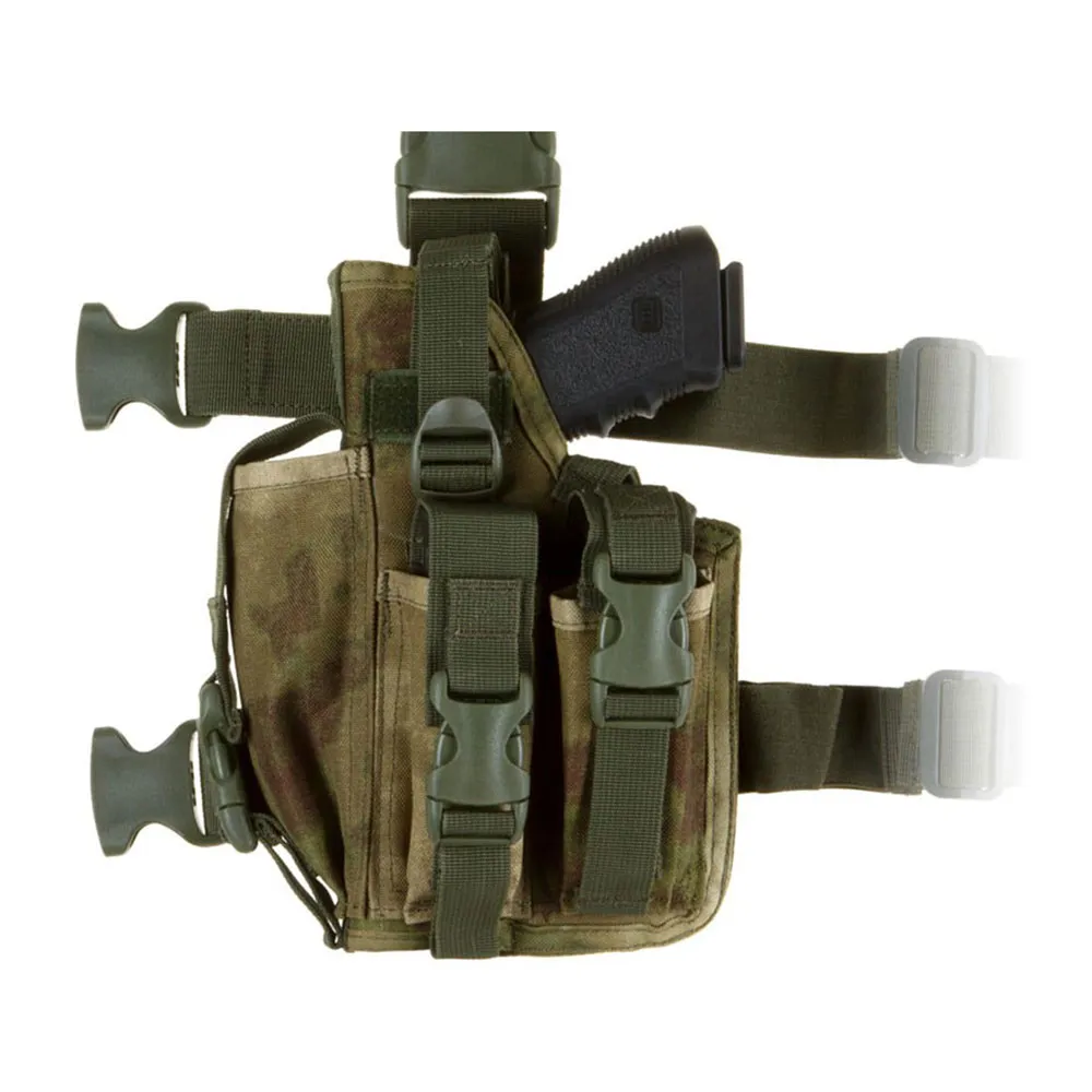 El SOF holster está equipado con tres bolsillos integrados para cargadores (uno es de tamaño grande y también puede adaptarse a un silenciador) y un panel de pierna integrado - sujeto con un clip para cinturón y correas elásticas en el muslo. El arma está asegurada con una correa ajustable y cierre de broche. Está hecho de tela 600D para garantizar durabilidad manteniendo un peso ligero.