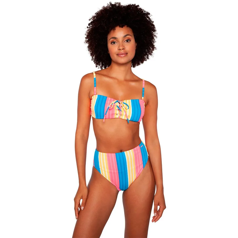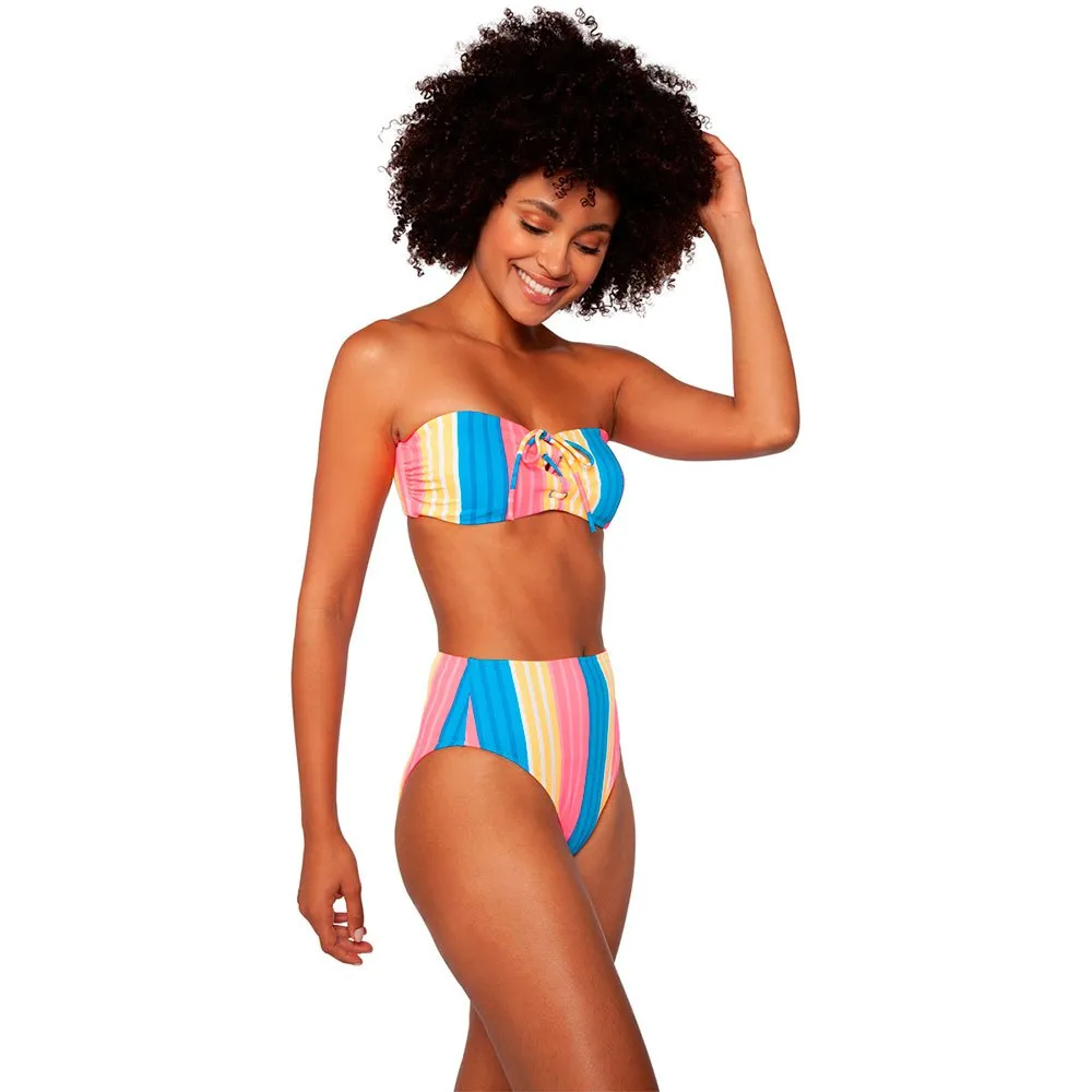 ¡Una gran tendencia para esta temporada es la cintura alta y este bikini tiene exactamente eso! En un fantástico diseño a rayas, la parte superior está atada en la parte delantera.