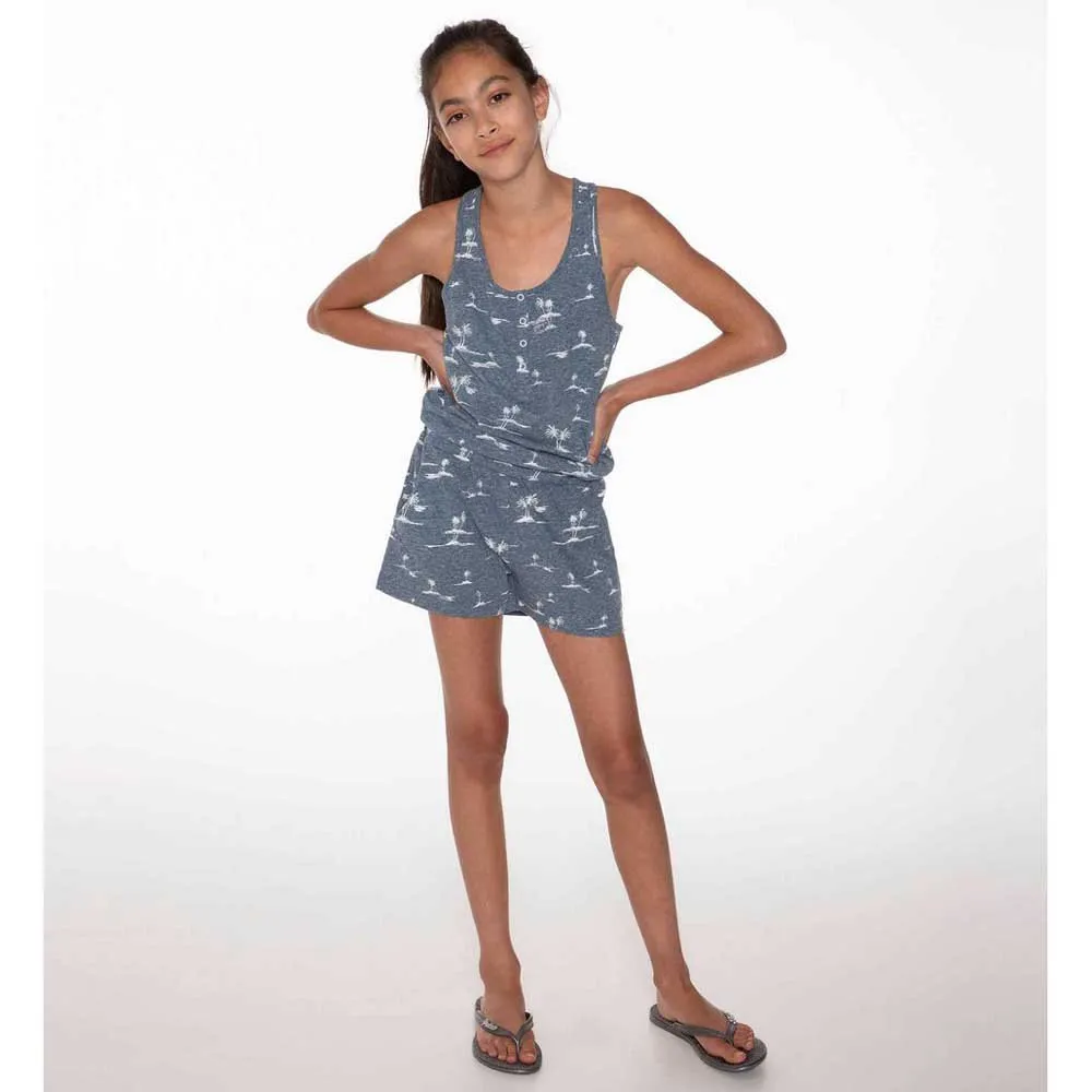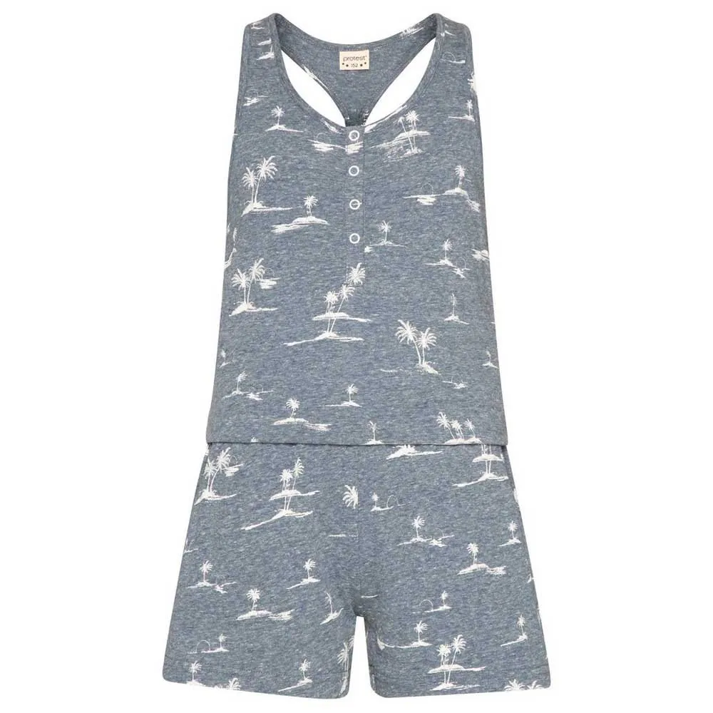 Echa un vistazo al fabuloso Honey JR de Protest. La tela jaspeada está estampada con un diseño de isla tropical. Hay una tapeta corta en el cuello con botones de presión. El mono tiene un estilo de espalda cruzada. La cintura es elástica y tiene prácticos bolsillos laterales. Perfecto para tu verano bajo el sol, el Honey JR de Protest.