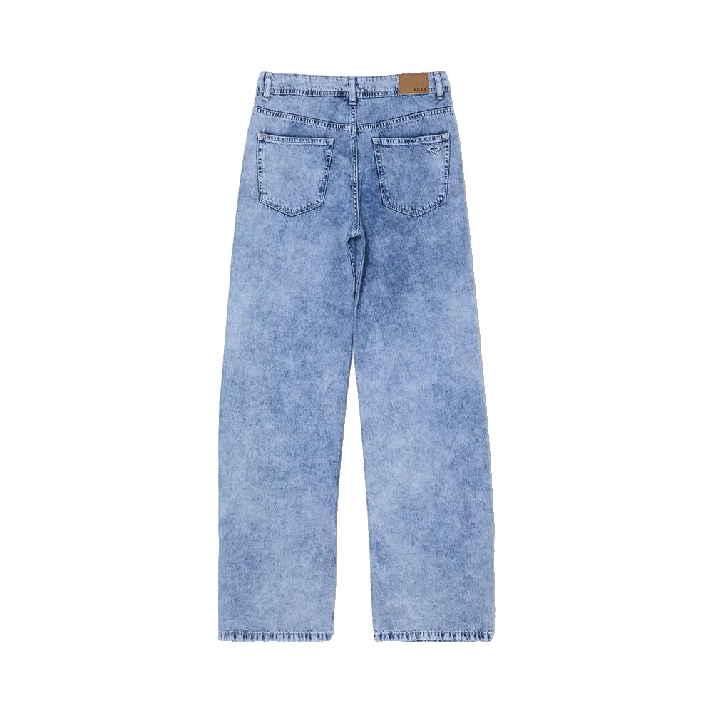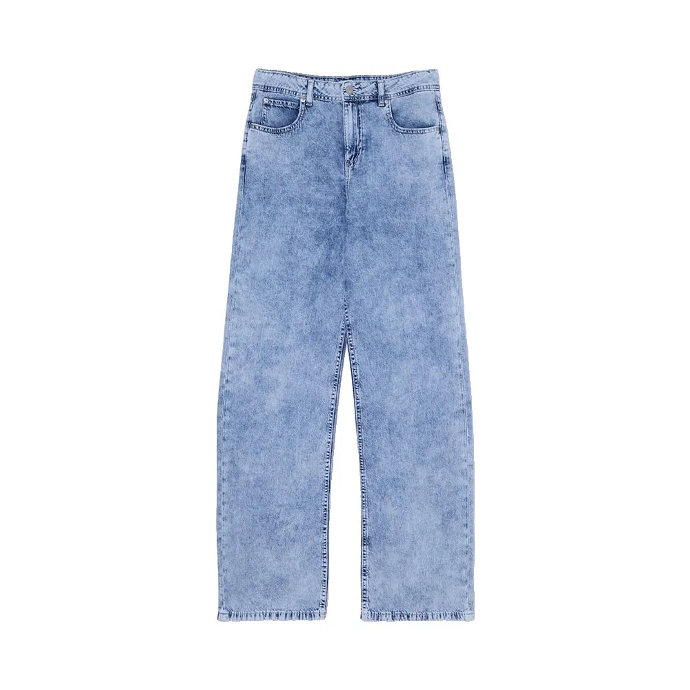Tejido:Algodón orgánico (8 oz.), Corte:cintura ajustada, pierna holgada, Cintura:cintura de talle mediano, Abertura en la cintura con botón metálico, Bragueta con cremallera, Detalle de remaches metálicos, Estilo clásico de cinco bolsillos y Largo regular con corte de pierna ancha.