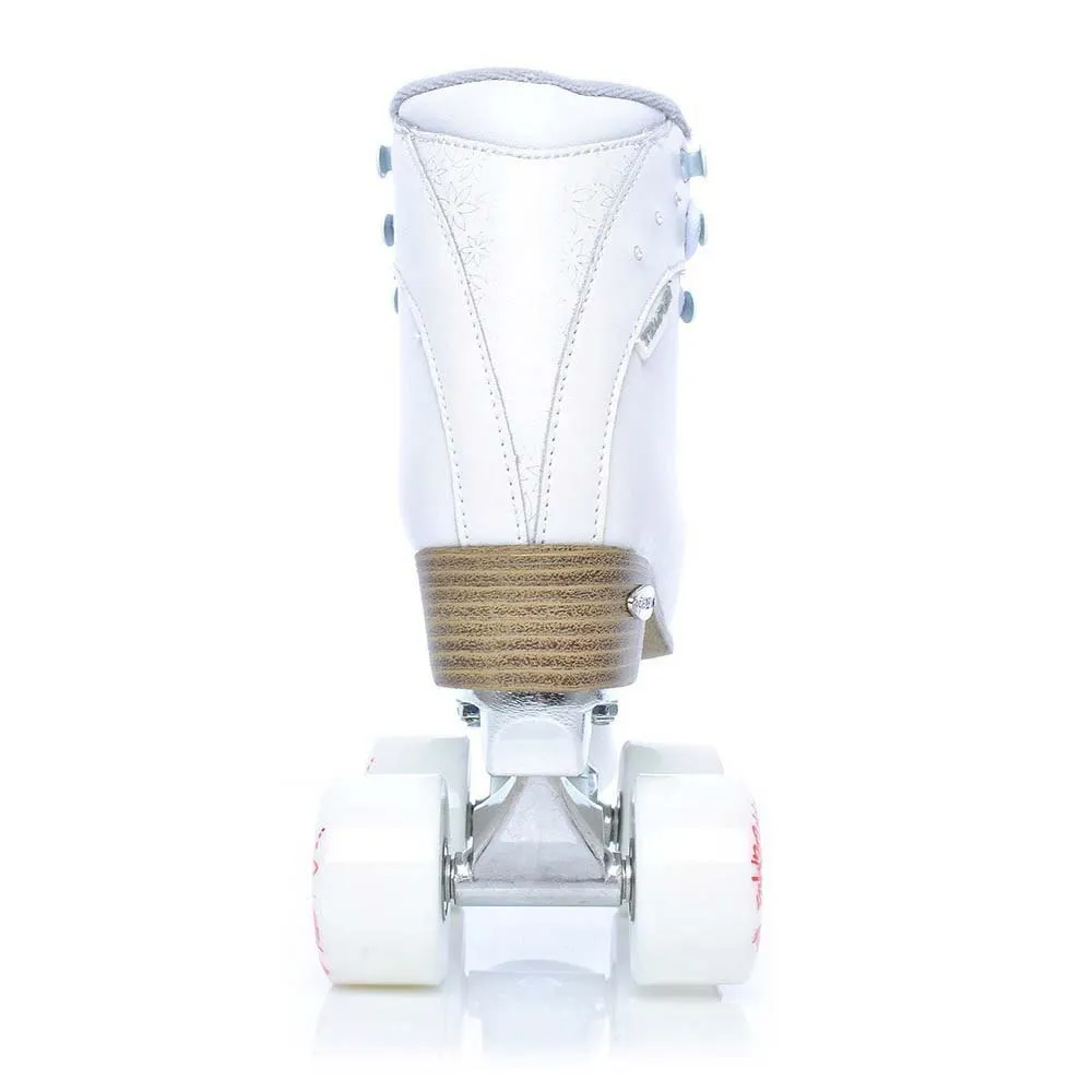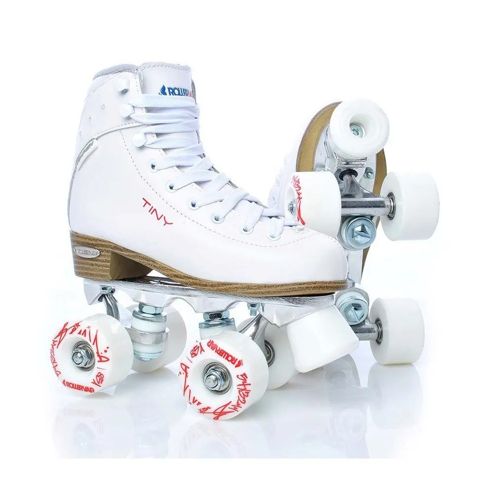Los patines de ruedas clásicos están equipados con cuatro ruedas, que están en dos filas. Adecuado para patinaje deportivo y recreativo, baile en patines. TINY PLUS están hechos de cuero genuino y la parte superior está equipada con cristales. Bota acolchada mediana con la transición a un refuerzo cómodo (más suave) por encima del tobillo que garantiza un movimiento cómodo. El forro está hecho de una malla BK que drena la humedad. El camión es de aleación de aluminio.