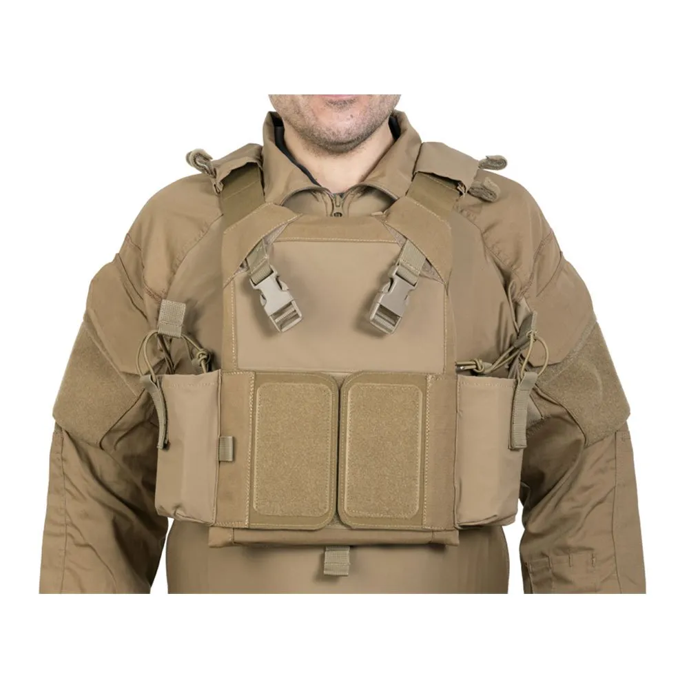 Plate Carrier on valmistettu joustavasta kankaasta ja Cordurasta, ja siinä on säädettävä joustava kuminauha mukavuuden ja vartalon istuvuuden takaamiseksi.
