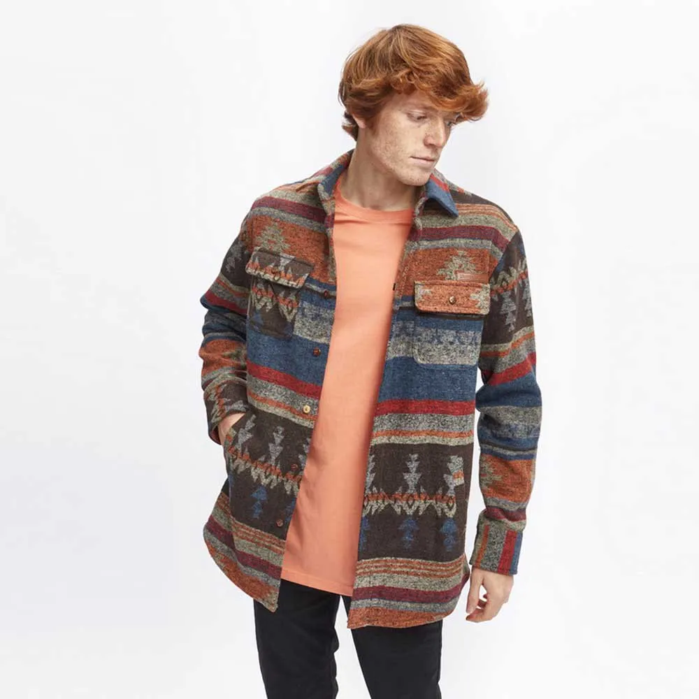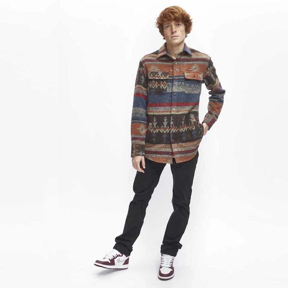 Apache-paitatakin erottuva ominaisuus on sen ainutlaatuinen ja kiehtova muotoilu. Monimutkainen, lankavärjätty kuvio on saanut inspiraationsa alkuperäiskansojen estetiikasta, varmistaen, että eloisa kuvio on kudottu suoraan kankaaseen. Toisin kuin painetut kuviot, tämä ylivoimainen tekniikka takaa, että värit ja yksityiskohdat pysyvät terävinä ja haalistumattomina pesusta toiseen. Tämä erottuva ulkonäkö yhdistettynä klassiseen paitakaulukseen ja täyteen nappikiinnitykseen luo ajattoman mutta nykyaikaisen siluetin, joka erottaa sinut joukosta. Toiminnallisiin yksityiskohtiin kuuluvat kaksi napillista rintataskua pienten välttämättömyyksien turvaamiseen ja huomaamattomat sivutaskut käsien lämmittämiseen, mikä lisää käytännöllisyyttä sen hienostuneeseen tyyliin.