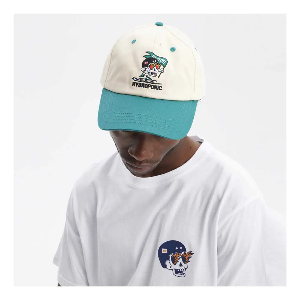 6 panel strapback Dad cap with a low cut and contrast curved visor featuring a skateboarding skull pushing for his life.