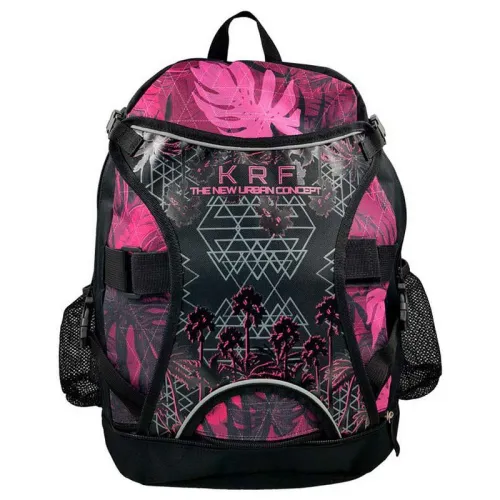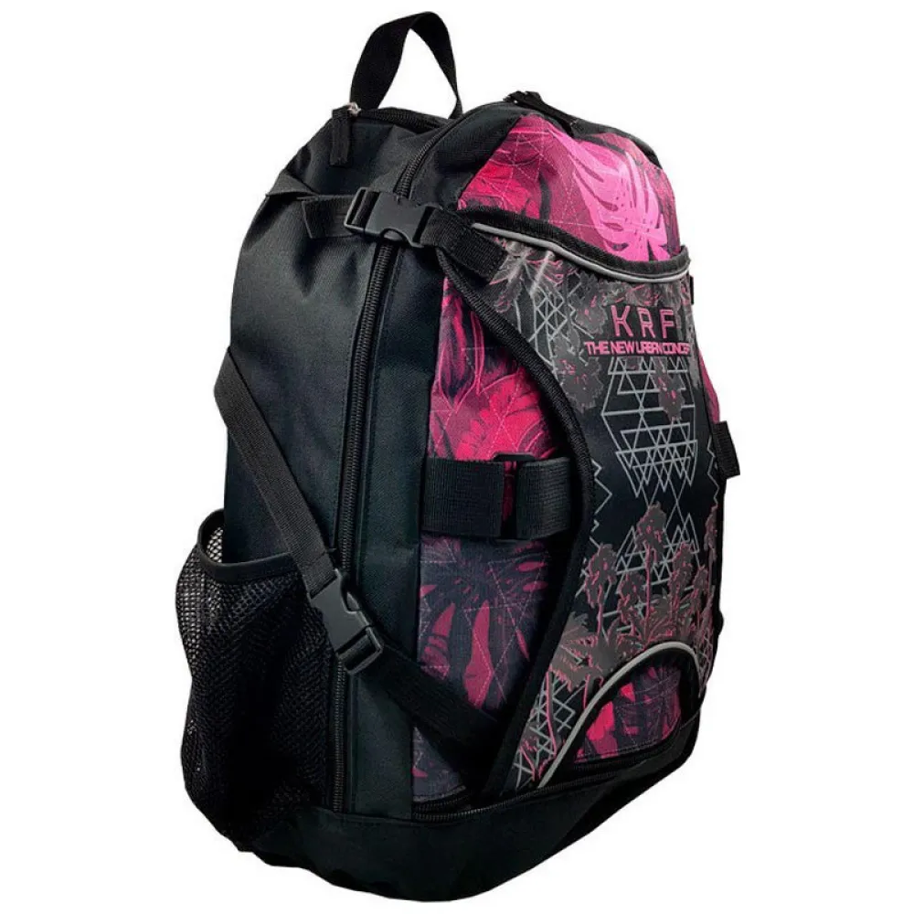Selkäreppu on suunniteltu mukavasti kuljettamaan rullaluistimia, olipa kyseessä kunto tai freeskate. Ulkotasku luistimille, jotka on kiinnitetty sivuille nailonhihnoilla ja keskellä olevalla nailonnauhalla luistimien pitämiseksi. Siinä on verkkotasku suojausten säilyttämiseksi. Suuri päälokero tavaroiden säilyttämiseen, taskut pienille esineille. Sen yläosassa on tasku matkapuhelimelle, ne on tarkoitettu kuulokkeille. Pehmustetut nauhat ripustettavaksi takana ja nailonhihna pitämään edessä ja kantamaan reppua mukavasti luistimillasi ilman sen liikettä. Nailonkahvalla. Verkkotaskut.