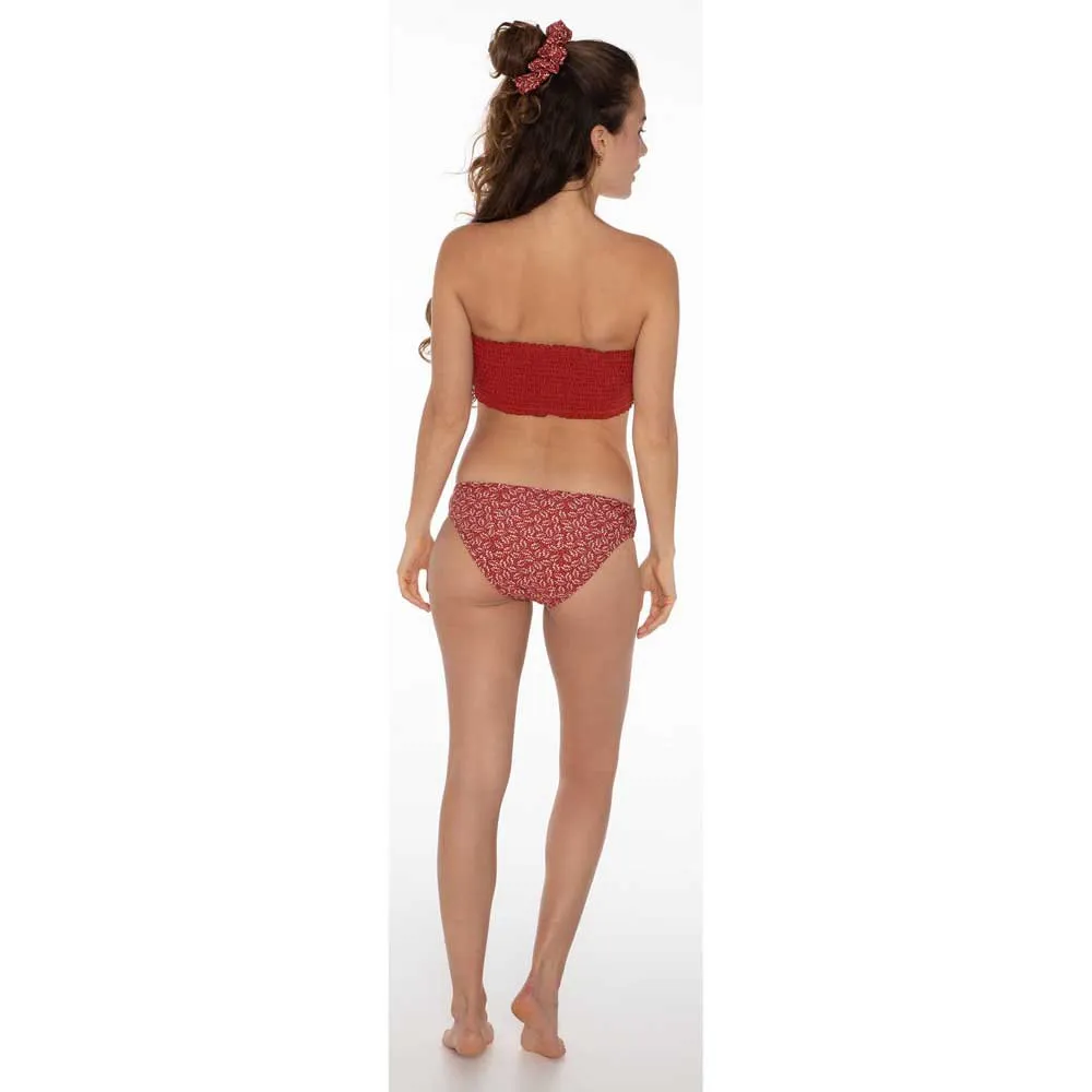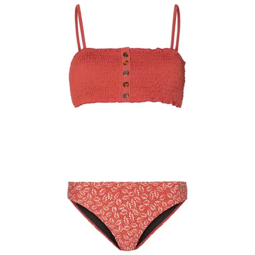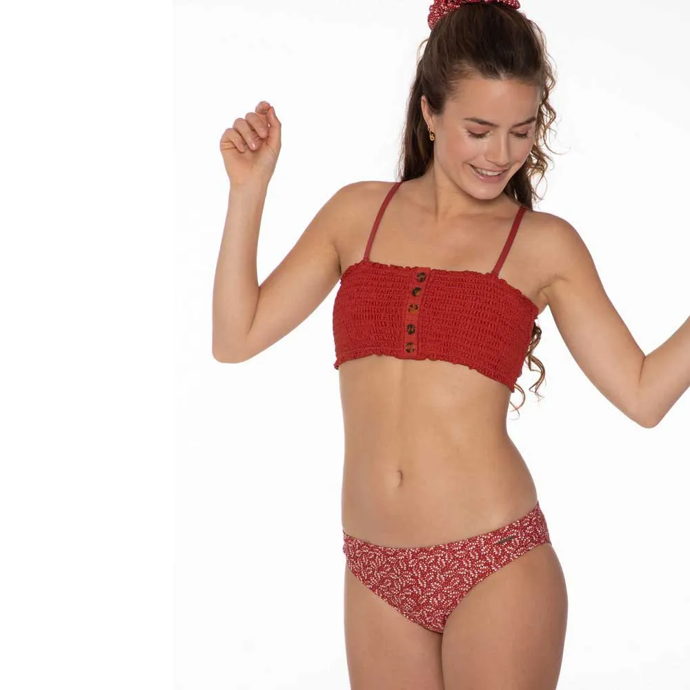 Rencontrez le magnifique Kitty by Protest. Ce bikini a un haut de bikini bandeau smocké. Les bretelles sont réglables et peuvent être retirées pour que vous puissiez obtenir un bronzage sans sangle. Il y a une rangée de boutons qui descendent le long du haut de bikini - ils ne s'ouvrent pas, ils décorent juste! Il y a des bonnets amovibles à séchage rapide pour plus de courbe et de soutien en cas de besoin. Le bas de bikini coupe classique est imprimé d'un magnifique motif de feuilles. Le tissu est également exempt de PFC dans un effort pour réduire l'utilisation de ce produit chimique et donc ses dommages à l'environnement. Un bikini qui se démarque dans la foule, le Kitty by Protest.