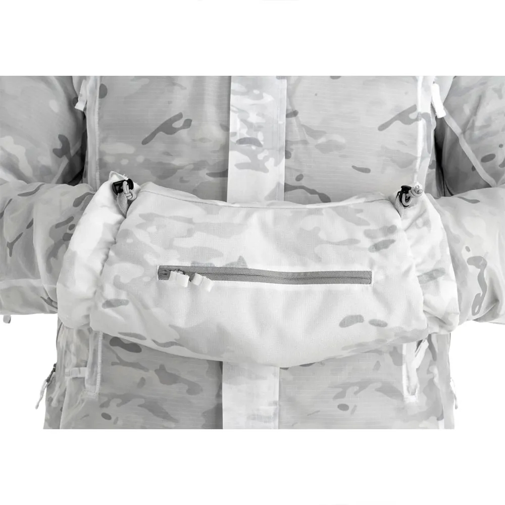 Dotato di sistema di attacco MOLLE, uno scomparto con cerniera per cuscinetti riscaldanti, polsini elastici e una regolazione della larghezza, il muff offre un isolamento altamente efficiente. La scelta del materiale combina durabilità con elevata ritenzione del calore e comfort.