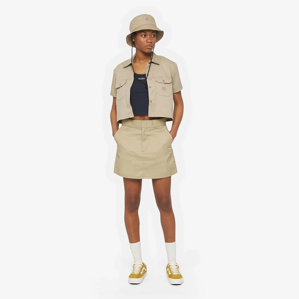Una mini a vita alta con zip, passanti per cintura, tasca laterale, tasche a filetto con bottoni sul retro e iconica etichetta Dickies intrecciata.