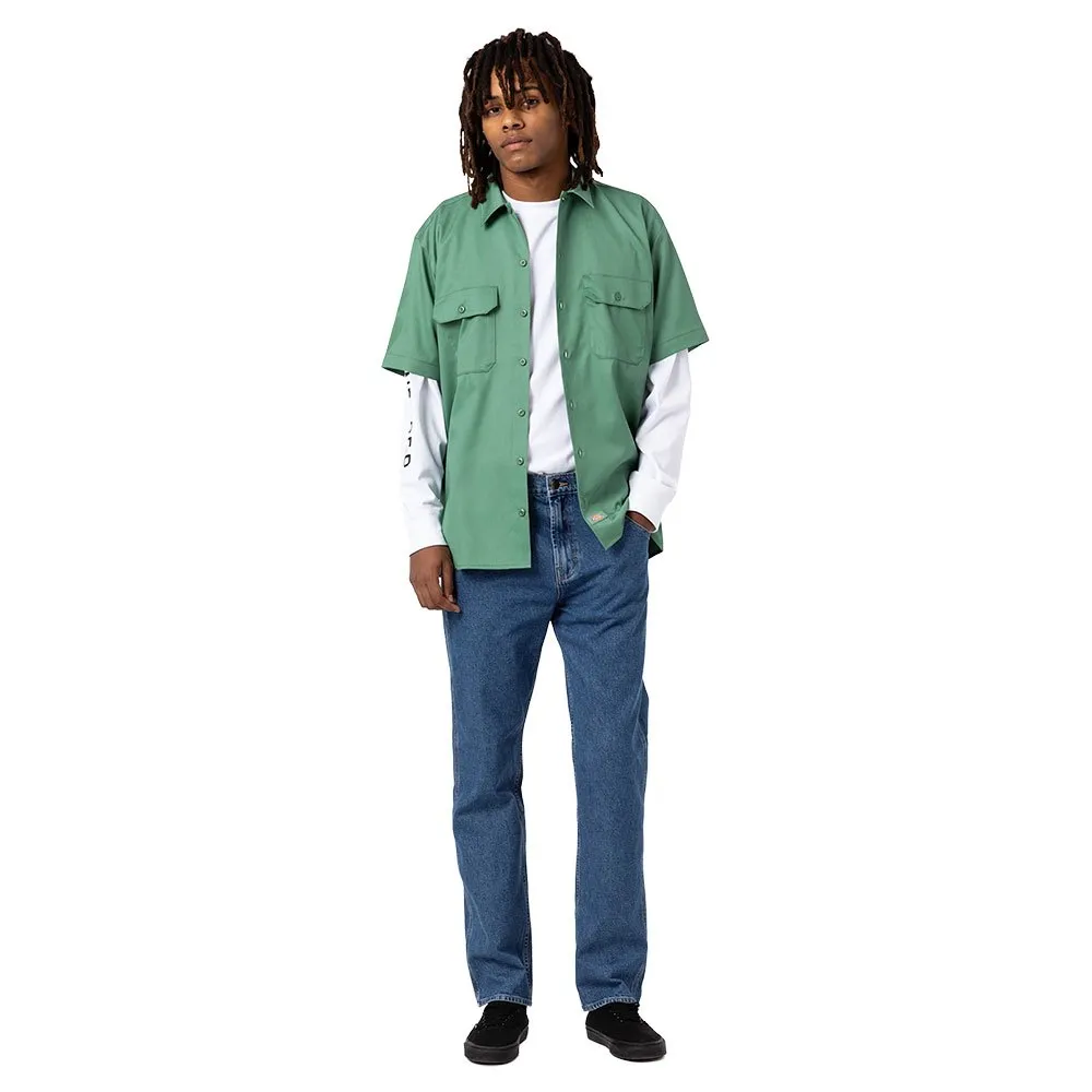 I pantaloni Houston Denim sono un jeans a cinque tasche con taglio rilassato, gamba dritta e vita regolare con la nostra iconica etichetta Dickies in tessuto sulla tasca posteriore.