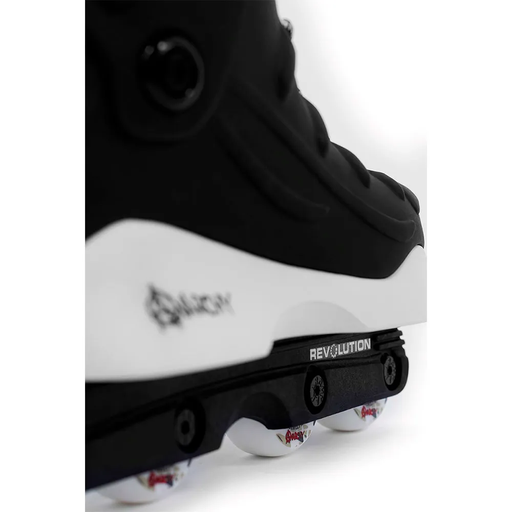 De Anarchy Revolution II is een harde schoen aggressive skate, met een extra breed zooloppervlak, perfect voor grinden.