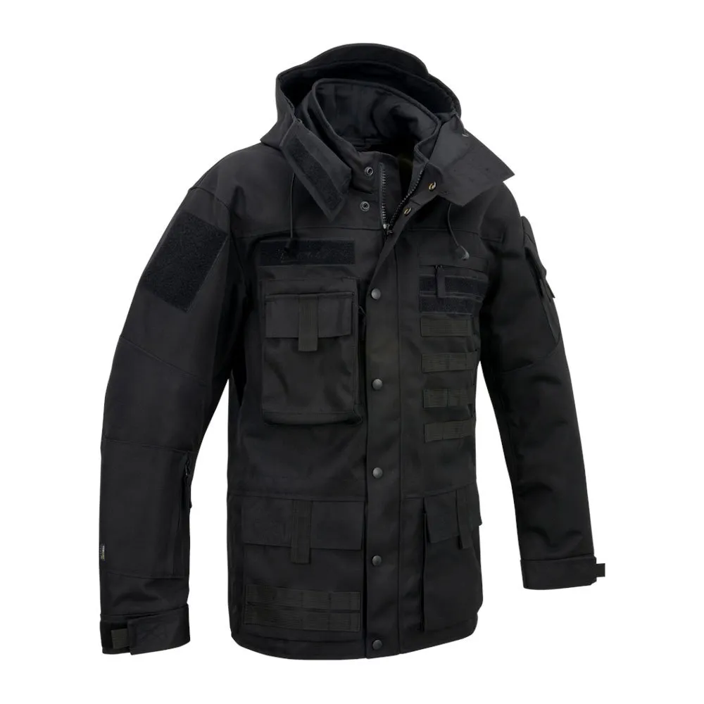 Deze jas van uitstekende kwaliteit is gemaakt van een zeer resistente en sterke Cordura stof. Hij is slijtvast en ontworpen om bestand te zijn tegen struiken, doornen en takken, waardoor hij perfect is voor buitenactiviteiten. De jas biedt goede bescherming tegen wind en aanhoudende regen. Hij is voorzien van een praktisch MOLLE-systeem voor accessoires. Let op: de maatvoering is ruim; overweeg een maat kleiner te bestellen voor een betere pasvorm, aangezien het ontwerp opzettelijk los zit voor bewegingsvrijheid.