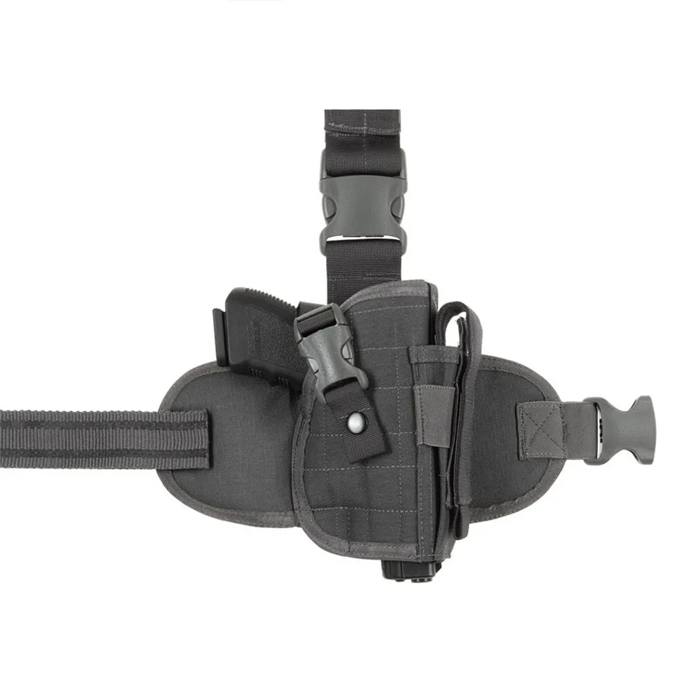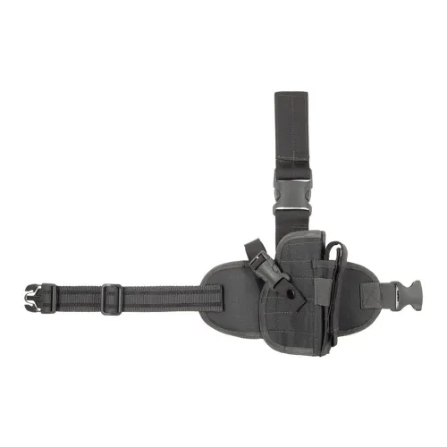 Universele Dropleg holster ontworpen om te passen op een breed scala aan middelgrote pistolen zoals bijvoorbeeld Glock 17 of Beretta 92. Hij is uitgerust met een geïntegreerd magazijnvak en een geïntegreerd beenpaneel dat met een riemclip en drie antislip elastische banden aan de dij wordt bevestigd.