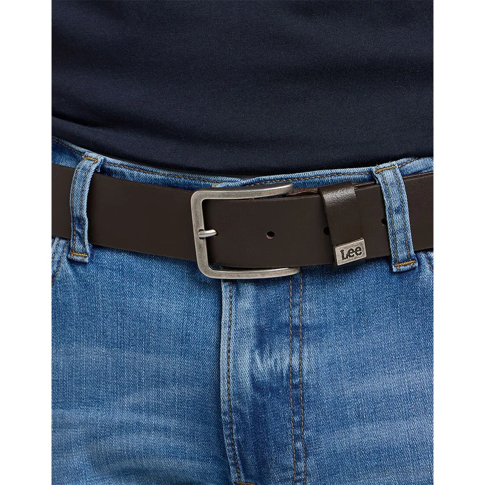 Deze riem is wit op zwart - of zwart op wit als je hem omkeert - en is voorzien van het Lee-merk.