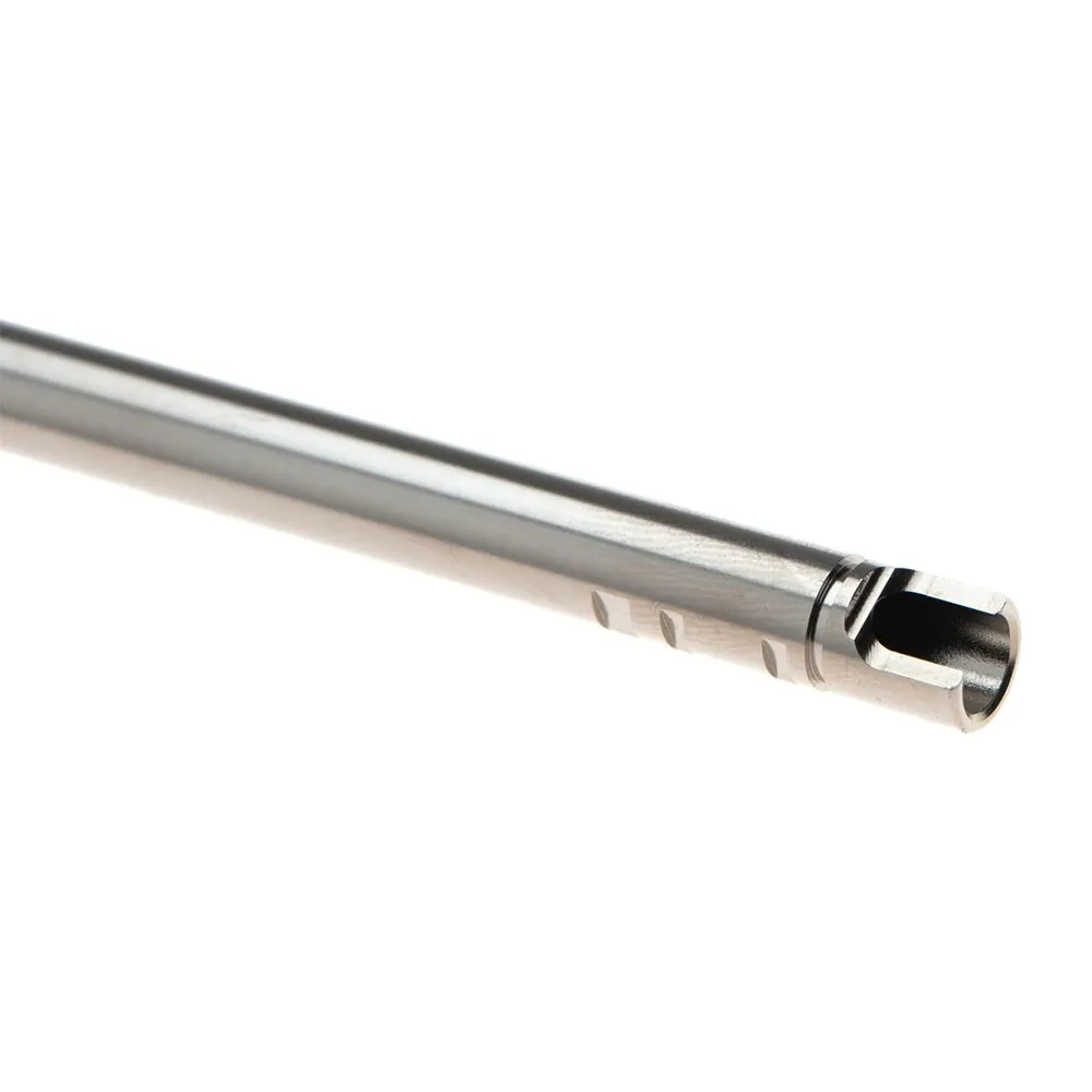 Deze binnenloop zit boordevol functies die ontworpen zijn voor één doel: prestaties. Het beschikt over een uitzonderlijk glad en gepolijst binnenoppervlak, wat de wrijving op de BB drastisch vermindert. Dit zorgt voor de soepelst mogelijke beweging van de kamer naar de monding, waardoor de energie die door de hop-up wordt overgedragen behouden blijft en een consistente spin wordt gehandhaafd. Bovendien beschikt het over een uniek ontworpen hop-up venster, geoptimaliseerd om naadloos samen te werken met een breed scala aan moderne buckings, vooral die uit de Maple Leaf familie. Deze synergie creëert een perfect contactvlak op de BB, wat zorgt voor een stabiele backspin voor een vlakke en consistente vliegbaan.