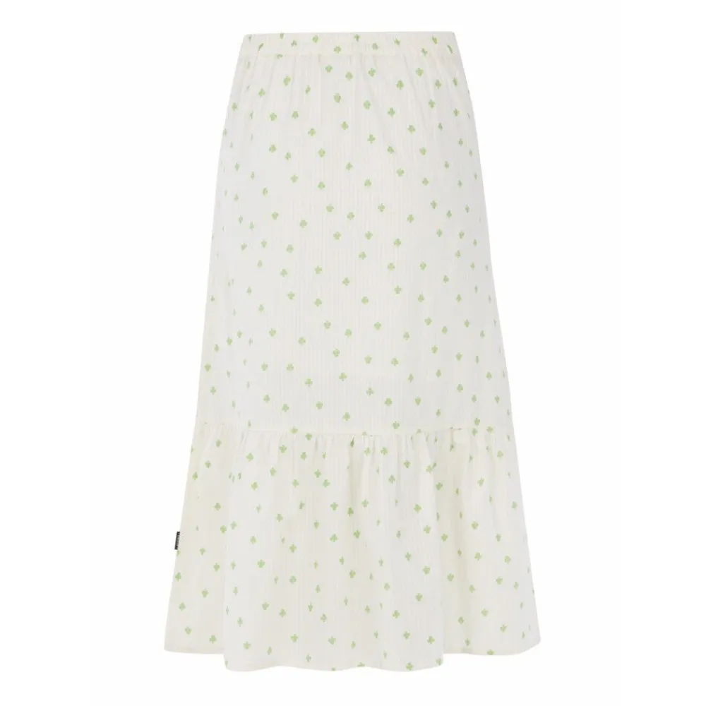 Deze prachtige rok heeft een mooi all-over klaverpatroon op een subtiele gestreepte achtergrond.