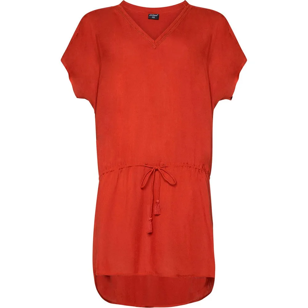 Bekijk de prachtige Cis by Protest. Deze tuniek is gemaakt van 100% viscose, een stof die bekend staat als comfortabel, ademend en lichtgewicht. De tuniek met normale pasvorm heeft een flatterende V-hals met kanten details. In de taille zit een koord met kwastjes. De Cis is aan de achterkant iets langer dan de voorkant. De tuniek die je van een feestje naar het strand kan brengen, de Cis van Protest.