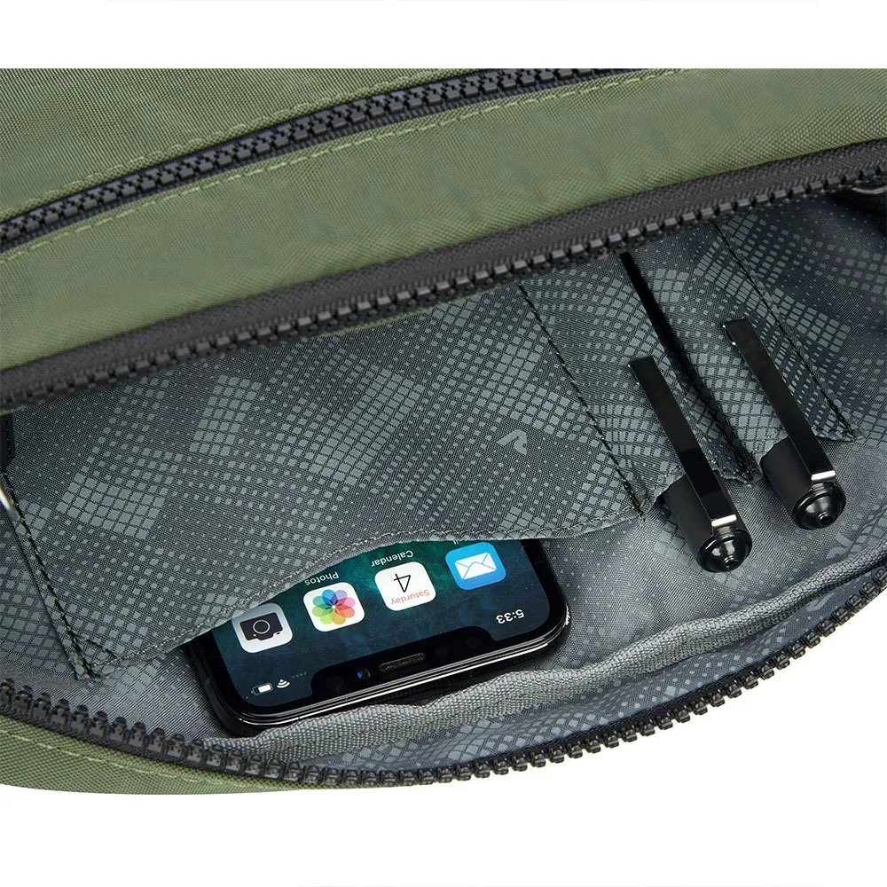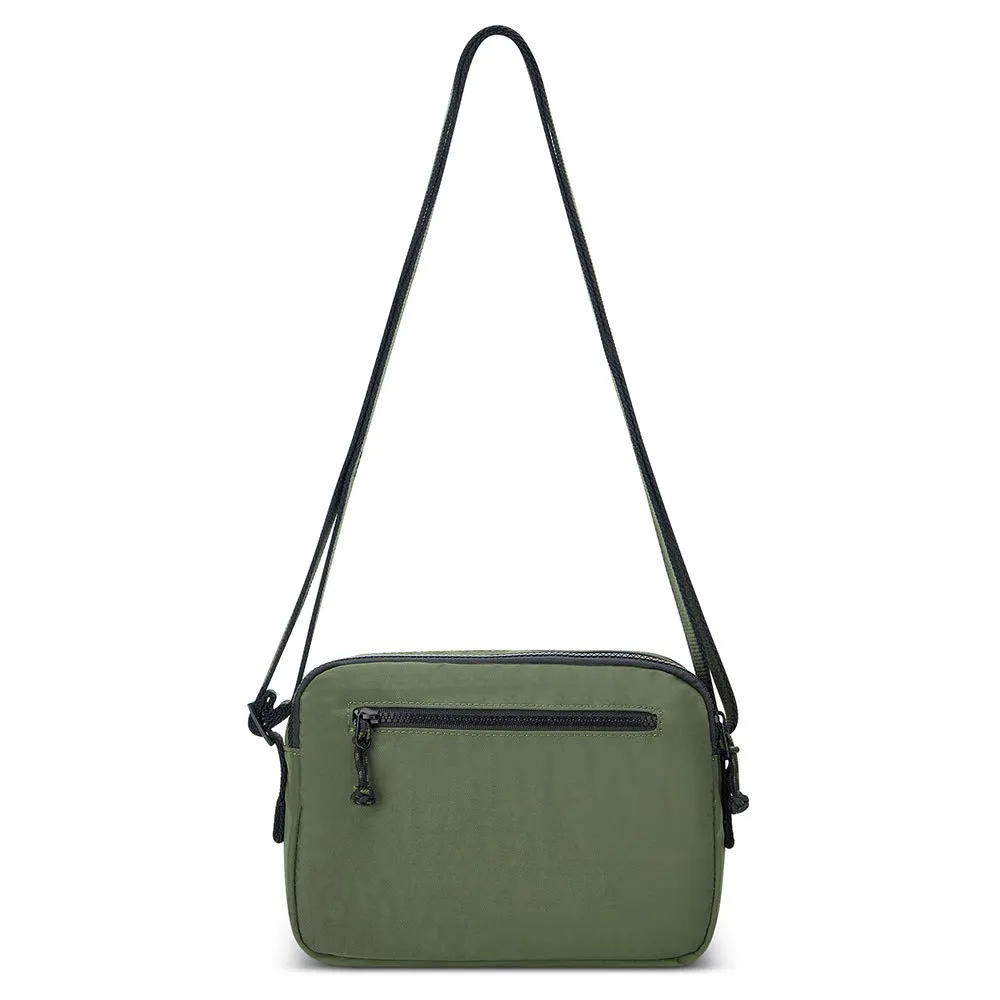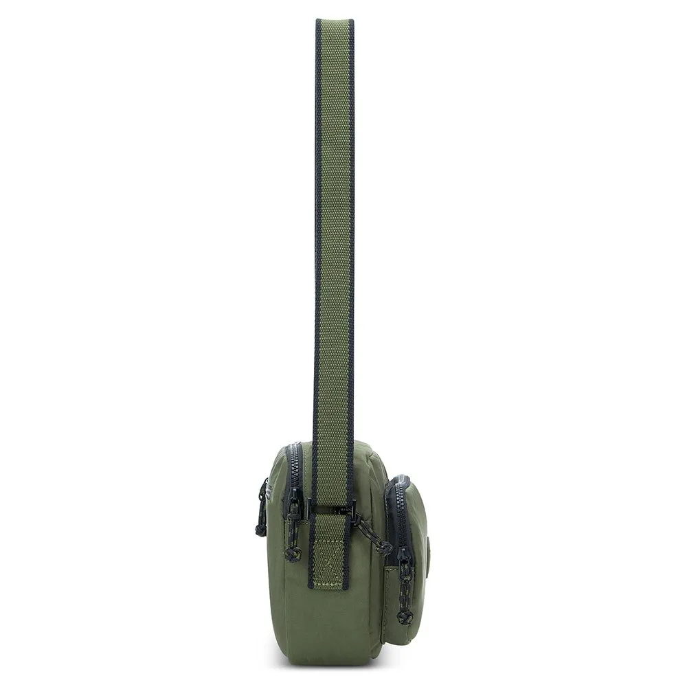 Gemaakt van Crinkle Nylon, een duurzame en waterdichte stof, heeft hij twee hoofdvakken, een ritsvak aan de voorkant en een veilig ritsvak aan de achterkant.