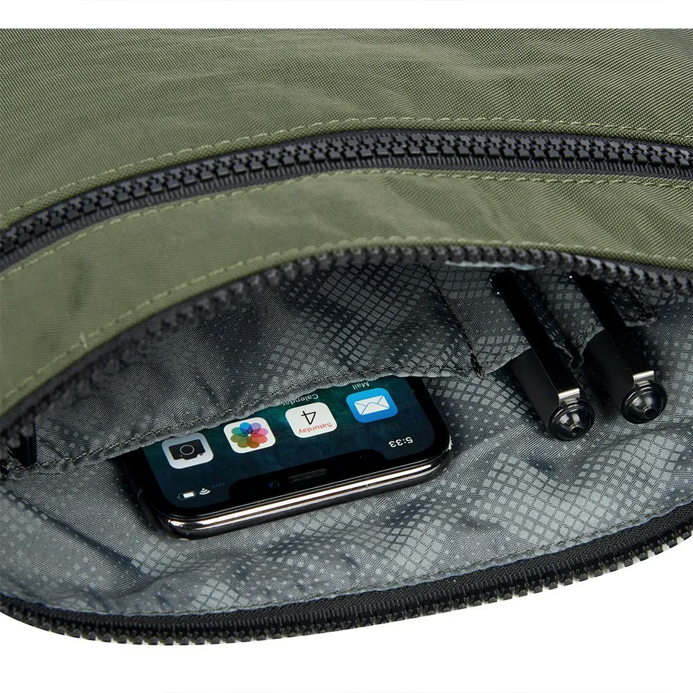 Gemaakt van Crinkle Nylon, een wasbaar en waterdicht materiaal, heeft hij 5 zakken: