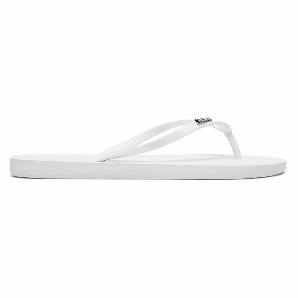 Slippers voor dames gemaakt van een bovendeel van rubber met metalen ROXY-pin, met een voetbed van gestructureerd rubber.