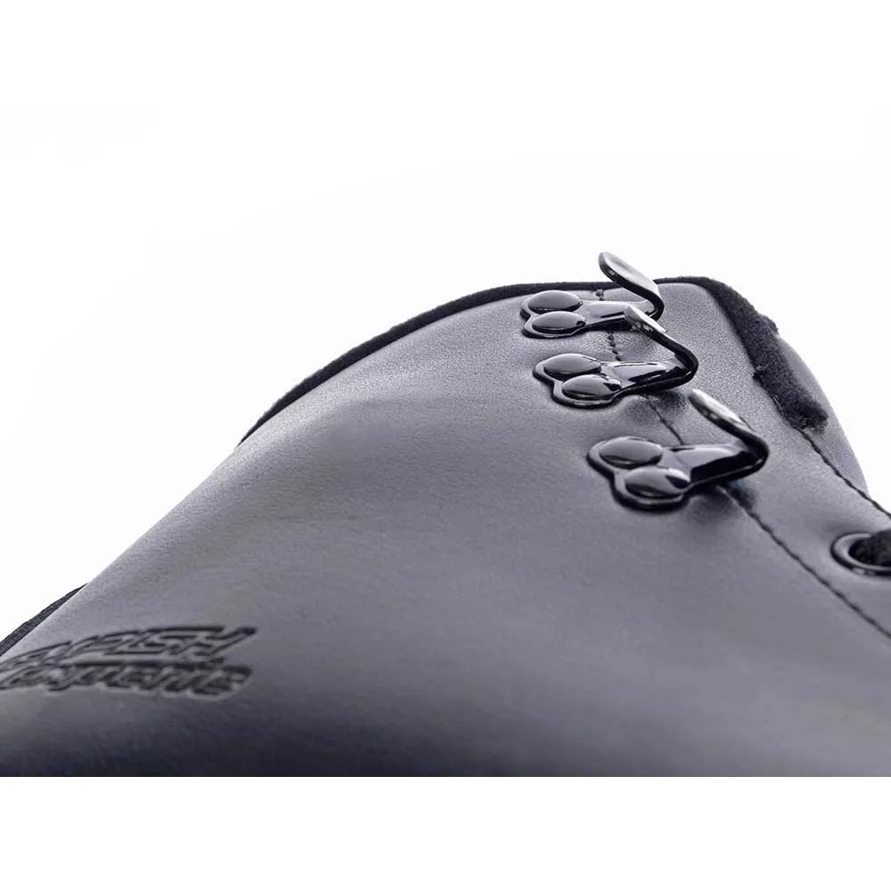 De laars is gemaakt van hoogwaardig echt leer wat de laars een kenmerk van exclusiviteit geeft. De kunstschaats heeft een stevige schaal met anatomische vorm van de enkel voor meer comfort en veiligheid en zorgt voor een natuurlijke plaatsing van de voet in de laars. Ingebed verband past zich aan de vorm van de voet aan en zorgt voor een comfortabele functie. Binnenvoering is gemaakt van een nieuwe generatie zwart fluwelen T-materiaal dat bestand is tegen slijtage en een uitstekende absorptiefunctie heeft.
