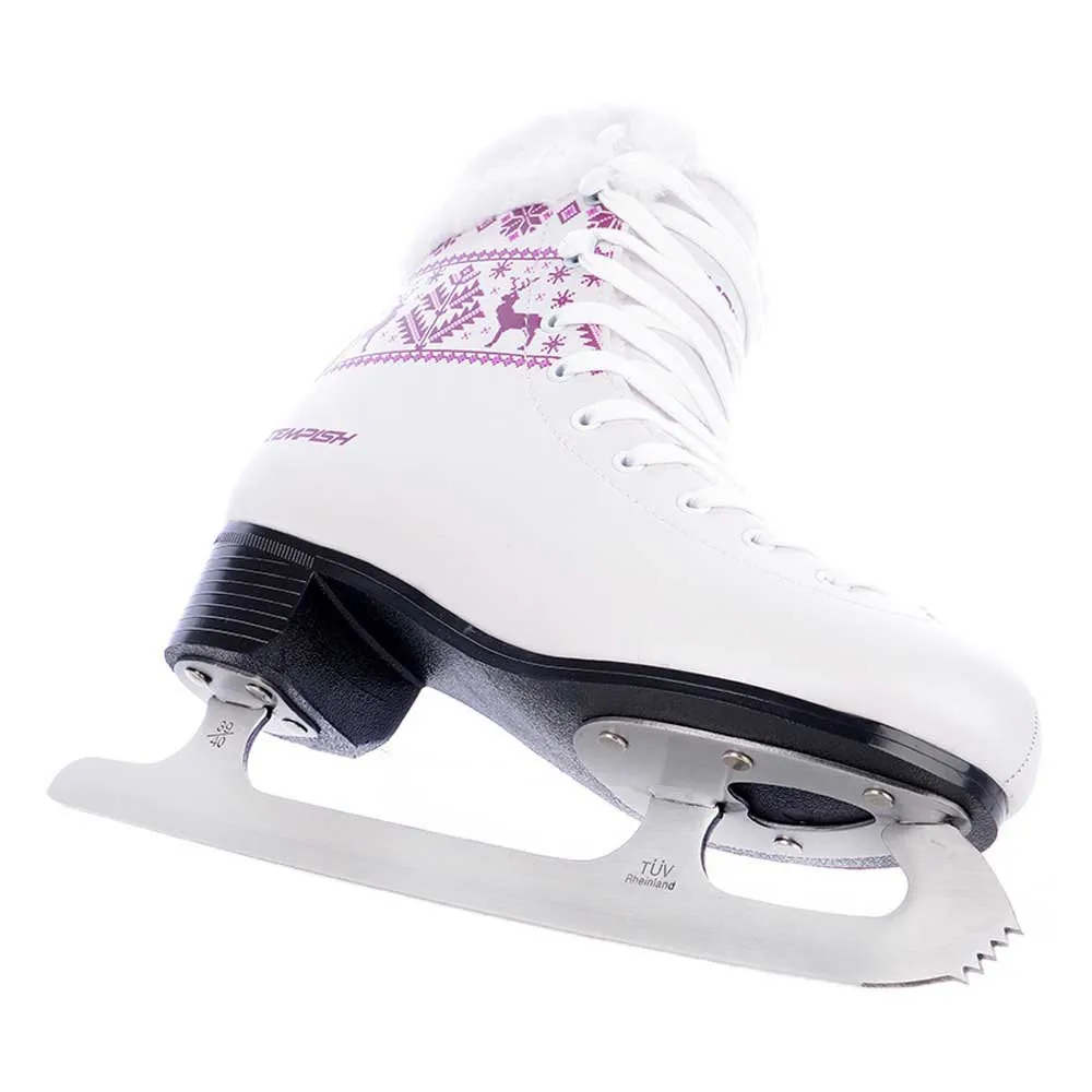 Klassieke damesschaats FREYA is bedoeld voor recreatief en modeschaatsen. Skate is gemaakt van PVC cool resist materiaal met PEARL EFFECT oppervlaktemodificatie van sprankelend uiterlijk gecombineerd met traditionele noordelijke winterprints. De schaats heeft een anatomische schuimbandage in het tonggebied. Het aangename gevoel van comfort en warmte wordt geleverd door de voering van imitatiebont. Het voelt prettig aan en heeft een goede isolerende functie. Het lemmet is gemaakt van roestvrij staal en gepolijst.