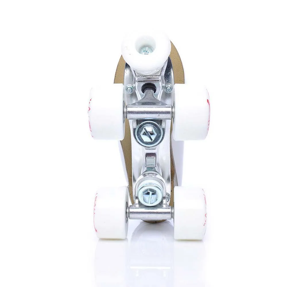 De klassieke rolschaatsen zijn uitgerust met vier wielen, die in twee rijen staan. Geschikt voor recreatief en sportief fitnessschaatsen, dansen op schaatsen. TINY PLUS is gemaakt van echt leer en het bovenwerk is voorzien van kristallen. Medium gewatteerde laars met de overgang naar comfortabele (zachtere) versteviging boven de enkel zorgt voor comfortabel bewegen. De voering is gemaakt van een vochtafvoerend BK-mesh. De vrachtwagen is van een aluminiumlegering.