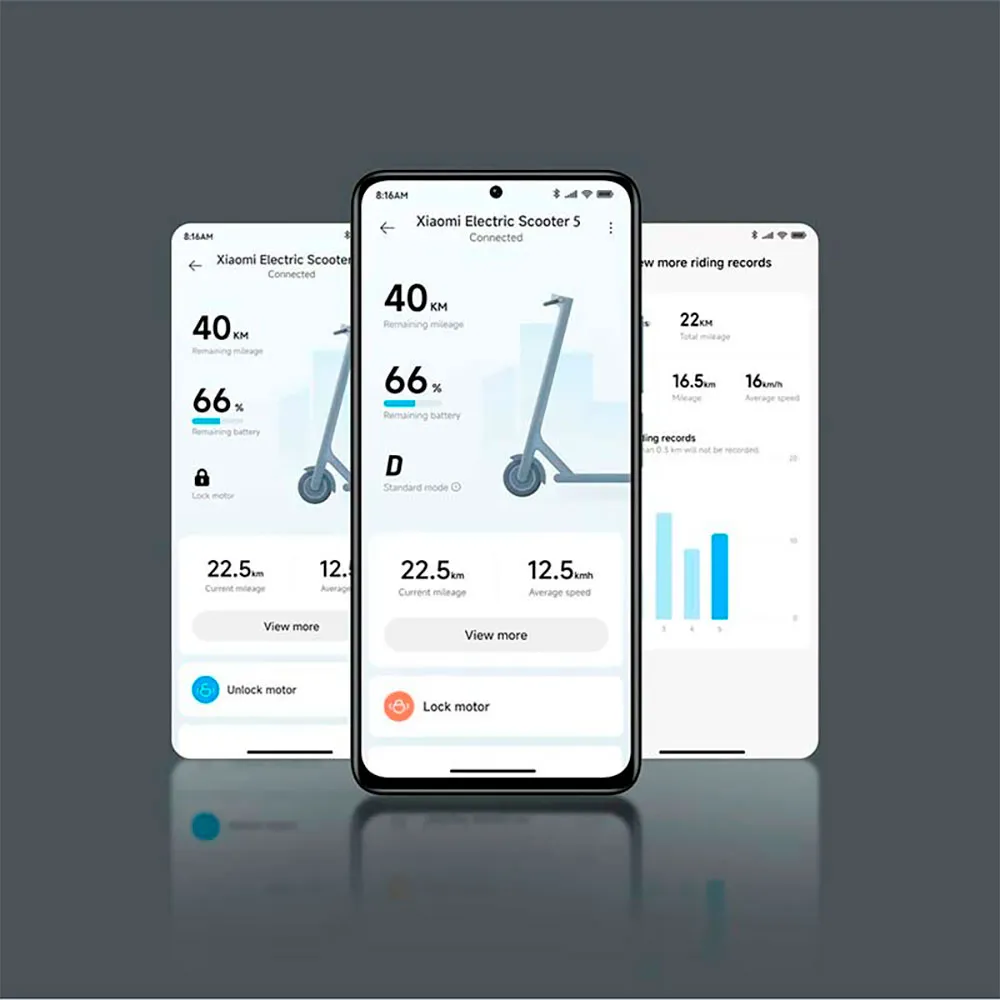 Uiteraard biedt de Mi Electric Scooter 5 toegang tot verschillende gedetailleerde informatie vanuit de Xiaomi Home-app, zoals batterijstatus, motorvergrendeling, automatische koplampactivering en firmware-update.