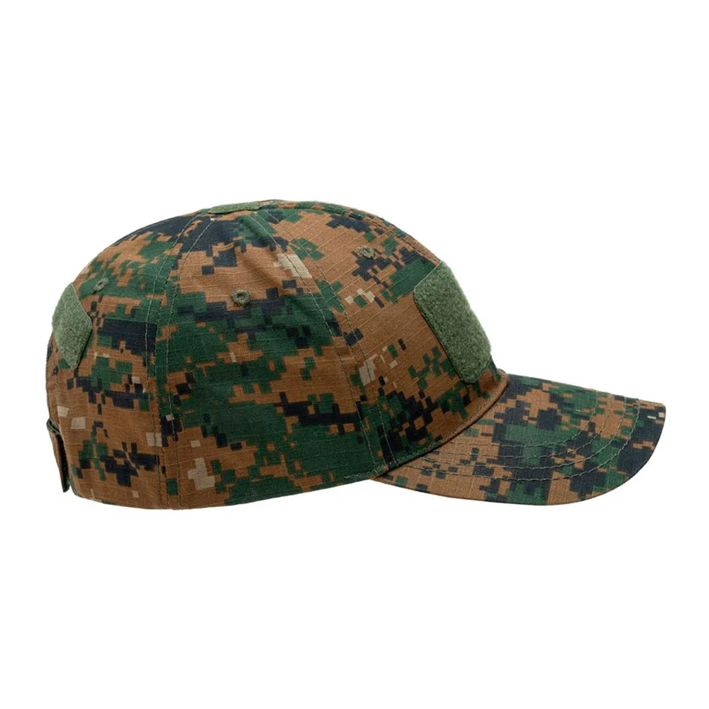 Klassisk baseballcaps designet for å gi kamuflasje og beskyttelse mot solen. Den er laget av Rip-Stop-stoff (65 % bomull / 35 % polyester) som gjør hatten lett og holdbar. Den er også hurtigtørkende - uansett om det er en varm, svett dag eller regnvær. På forsiden, baksiden og toppen er det plassert borrelåspaneler for enhets-ID eller moral-lapper. Størrelsen kan justeres med borrelåsstropp på baksiden av capsen.