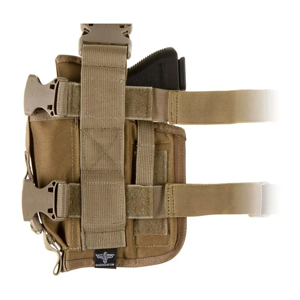 - SOF-hylsteret er utstyrt med tre integrerte magasinlommer (en er overdimensjonert og kan også passe til en lyddemper) og integrert benpanel - festet med belteklips og elastiske stropper til låret.