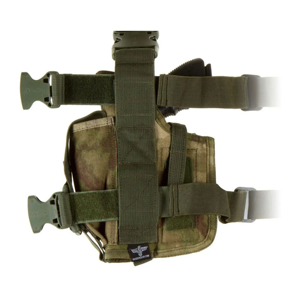 - Kabura SOF jest wyposażona w trzy zintegrowane ładownice na magazynki (jedna jest ponadgabarytowa i może również pomieścić tłumik) oraz zintegrowany panel udowy - mocowany do uda za pomocą klipsa do paska i elastycznych pasków.