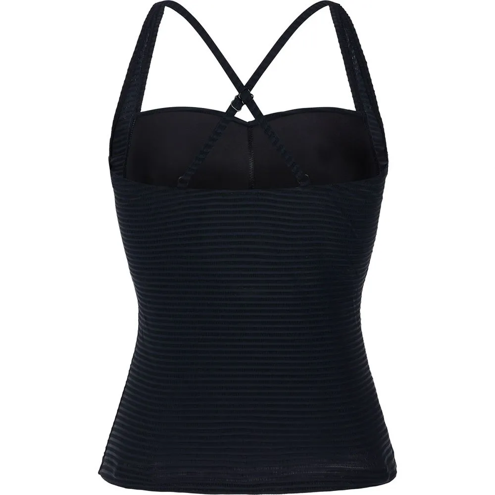 Ten top tankini jest wykonany z pięknego materiału z fakturowanym poziomym paskiem, dodając stylowego akcentu do Twojego wyglądu przy basenie.
