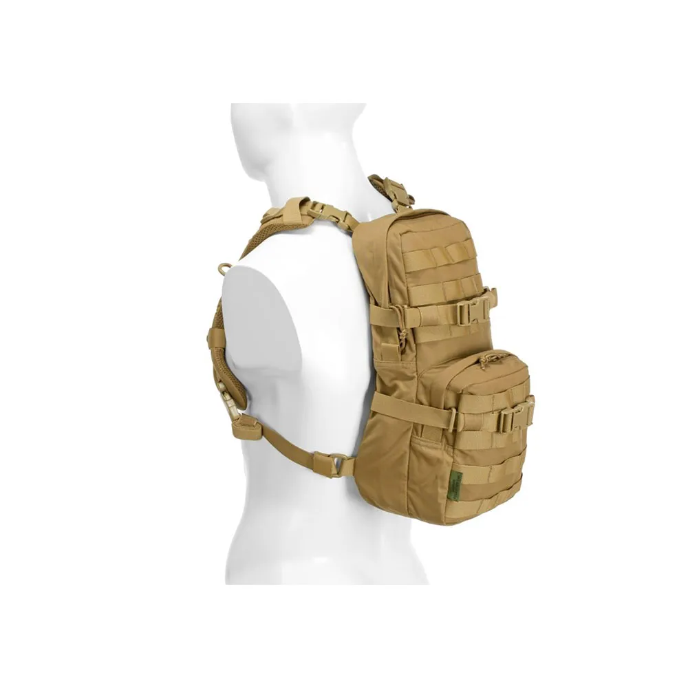 Zawiera wewnętrzny rękaw na bukłak i zewnętrzne taśmy MOLLE do mocowania dodatkowych kieszeni.