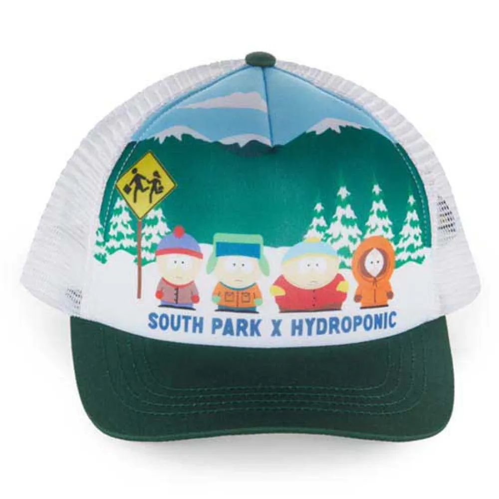 Boné snapback de malha de 5 painéis da South Park X Hydroponic Official Collaboration com corte baixo e uma impressão digital especial South Park na viseira e nos painéis frontais.
