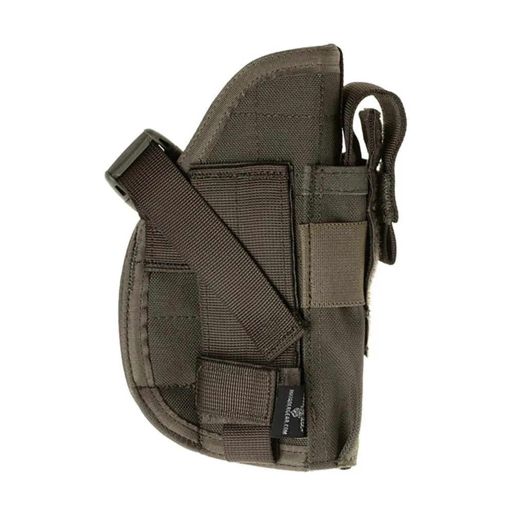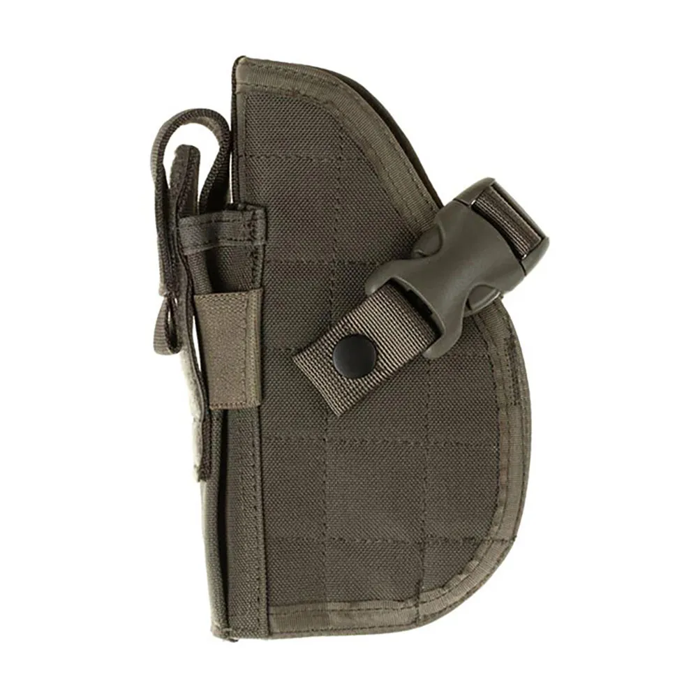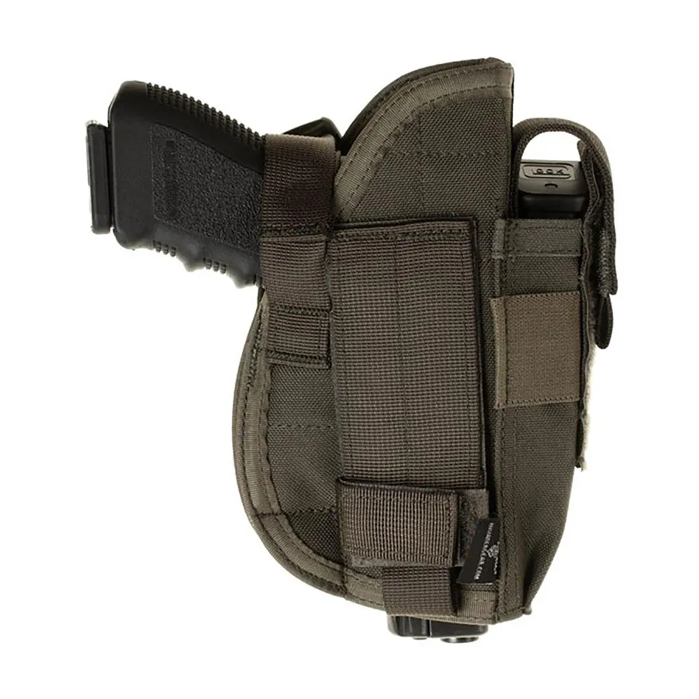 Versão canhota do coldre universal projetado para caber uma ampla variedade de pistolas de tamanho médio, como por exemplo Glock 17 ou Beretta 92. Ele possui um porta-carregador integrado e fechamento de cinto com ganchos e laços.