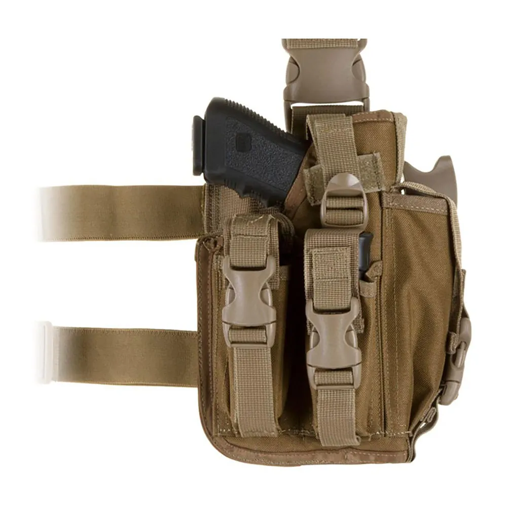 - O coldre SOF é equipado com três bolsas de revista integradas (uma é grande demais e também pode caber um silenciador) e painel de perna integrado - preso com um clipe de cinto e tiras elásticas na coxa.