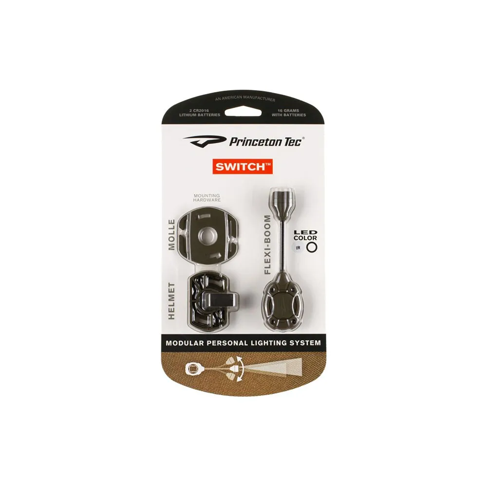 Duas baterias 2016 fornecem energia para a lanterna de cabeça. Um botão superior é usado para operar e alternar os modos da lanterna de cabeça. O versátil sistema de montagem da Princeton Tec é integrado ao Switch MPLS. Esta solução permite a fixação em plataformas PALS/Molle, ARC e trilhos Picatinny. Um braço flexível permite direcionar a fonte de luz na direção correta. Com dimensões supercompactas e baixo peso, a Switch MPLS é uma perfeita "luz tática" para aplicações militares.