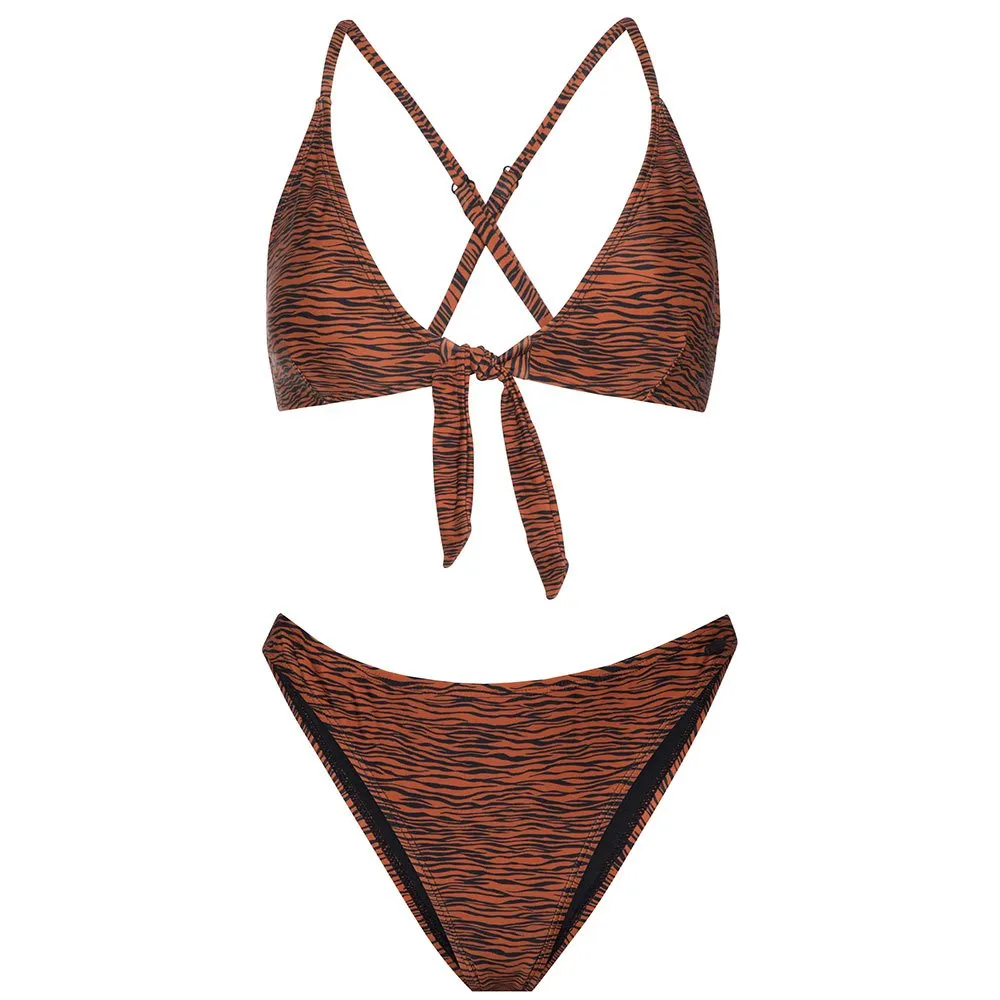 Parte de baixo de biquíni de perna alta, top de biquíni triangular, tecido sustentável, sem PFC, ajuste normal, estampa animal, cintura normal, sem copa, fechamento traseiro, fechamento frontal, sem fio, não moldado, acolchoamento removível, sem push up, copos de secagem rápida, UPF 50 proteção.