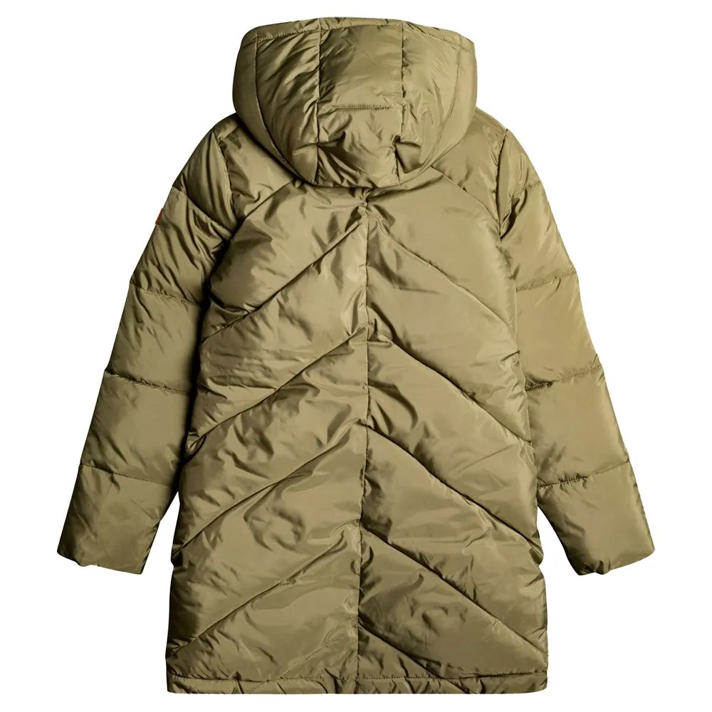 Fecho frontal de zíper, acolchoado Chevron, cordão no capuz, patch de camurça ROXY.