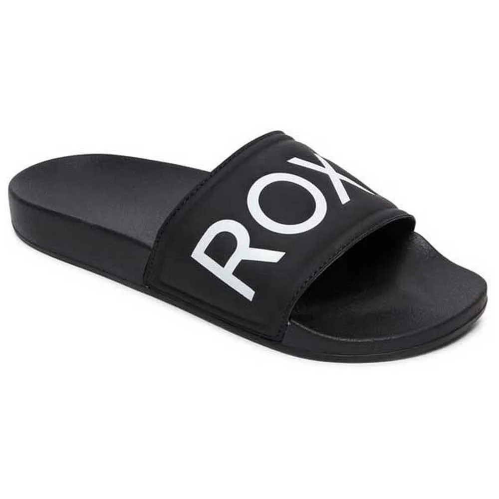 Sliders para mulheres com uma parte superior de borracha forrada de nylon com coração ROXY em relevo e uma palmilha em EVA moldada.