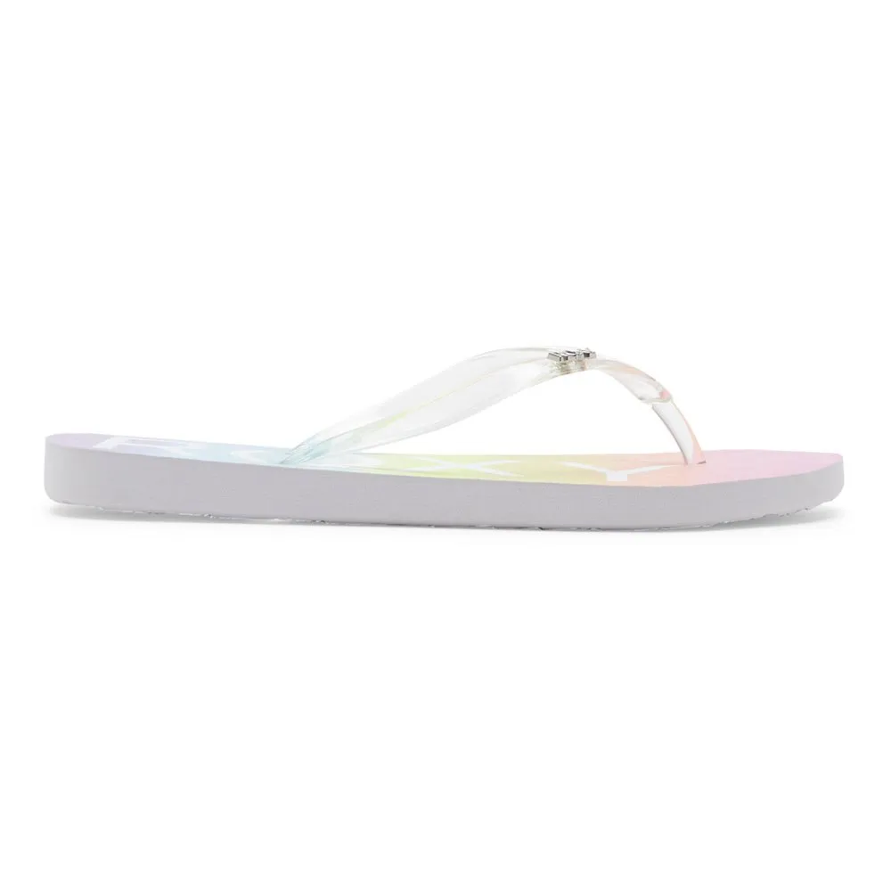 Sola exterior de borracha com impressão vintage ROXY O cabedal durável de TPU oferece um ajuste flexível e confortável, enquanto o icônico pino com o logo ROXY serve como uma marca de autenticidade. A palmilha de borracha texturizada é realçada com uma estampa clássica do logo ROXY, e o design é completado por uma sola de borracha durável que apresenta uma estampa vintage exclusiva da ROXY, oferecendo uma referência nostálgica à rica herança de surf da marca, ao mesmo tempo que proporciona tração confiável