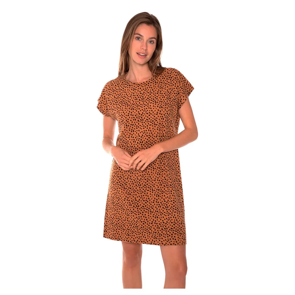 Den här bomullsblandningsklänningen är tryckt med en helbladdesign.