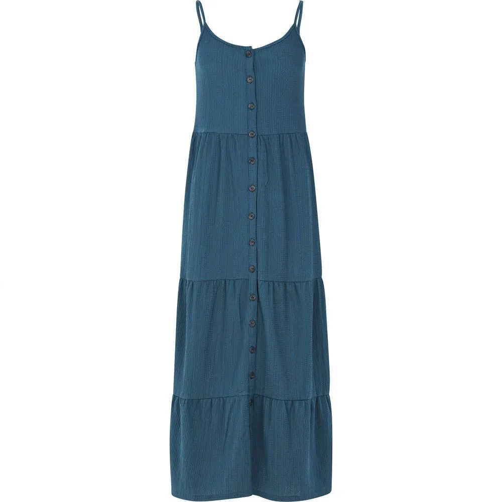 Denna vackra sommarklänning med spaghettiband har en härlig urringning och knappar som löper hela vägen ner framtill.